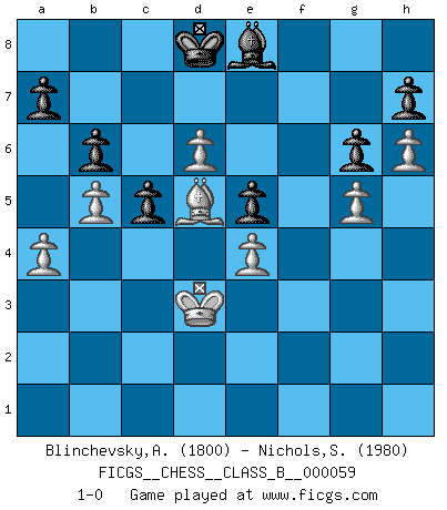 Last move : 1-0 2008 November 2 17:42:9 [Event "FICGS__CHESS__CLASS_B__000059"] [Site "FICGS"] [Date "2008.10.12"] [Round "1"] [White "Blinchevsky,Alexander"] [Black "Nichols,Scott"] [Result "1-0"] [WhiteElo "1800"] [BlackElo "1980"] 1.d4 Nf6 2.c4 c5 3.d5 d6 4.Nc3 g6 5.e4 Bg7 6.Bd3 O-O 7.h3 e6 8.Nf3 exd5 9.exd5 Re8+ 10.Be3 Bh6 11.O-O Bxe3 12.fxe3 Nh5 13.Qd2 Nd7 14.e4 Qe7 15.g4 Ng7 16.Qf4 Rf8 17.Rf2 f6 18.Raf1 b6 19.h4 Ba6 20.Be2 Ne5 21.Qg3 Rad8 22.h5 Bc8 23.Nxe5 fxe5 24.h6 Rxf2 25.Rxf2 Ne8 26.g5 Qd7 27.a3 Nc7 28.Qf3 Qe7 29.Qf6 Qxf6 30.Rxf6 Ne8 31.Rf2 Nc7 32.b4 Rf8 33.bxc5 Rxf2 34.Kxf2 dxc5 35.Nb5 Nxb5 36.cxb5 Kf7 37.Ke3 Bd7 38.Bc4 Ke7 39.d6+ Kd8 40.a4 Be8 41.Be6 Bd7 42.Bd5 Be8 43.Kd3 1-0 Benoni defense, Hromodka system Kingside Castling by player Black (move 6) Kingside Castling by player White (move 11) Player White won this chess game. Follow this game move after move (download)The passed Pawn is a criminal, who should be kept under lock and key. Mild measures, such as police surveillance, are not sufficient. (Aaron Nimzovich) Wie kann ich Remis annehmen? Ich weiß ja gar nicht, wie ich stehe! (Fritz Sämisch) Debemos de asegurarnos de que el Ajedrez no se convierta en un lenguaje muerto, muy interesante, pero solo para un grupo muy pequeño. (Sytze Faber) A ce moment-là, je menaçais de comprendre la position ! (Clément L'Heureux) Whoever said the pen is mightier than the sword obviously never encountered automatic weapons. (US General Douglas MacArthur)