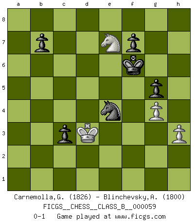 Last move : 0-1 2009 June 16 20:12:27 [Event "FICGS__CHESS__CLASS_B__000059"] [Site "FICGS"] [Date "2008.10.12"] [Round "1"] [White "Carnemolla,Giampaolo"] [Black "Blinchevsky,Alexander"] [Result "0-1"] [WhiteElo "1826"] [BlackElo "1800"] 1.e4 e6 2.d4 d5 3.exd5 exd5 4.Bd3 Bd6 5.Ne2 Nf6 6.O-O O-O 7.Bf4 Bg4 8.f3 Bh5 9.c3 Re8 10.Bxd6 Qxd6 11.Na3 a6 12.Nc2 Nbd7 13.Re1 Bg6 14.Bxg6 hxg6 15.Qd2 Nb6 16.b3 a5 17.Nf4 a4 18.Nd3 Rxe1+ 19.Rxe1 axb3 20.axb3 Nbd7 21.g3 Nf8 22.Kg2 Ne6 23.Ncb4 g5 24.Ne5 c5 25.dxc5 Qxc5 26.Nbd3 Qb6 27.Nb4 Rd8 28.Re2 d4 29.Qe1 Nc5 30.Nc4 Qc7 31.Re7 Rd7 32.Rxd7 Qxd7 33.Qf2 Nxb3 34.Qb2 Qe6 35.Qxb3 g4 36.fxg4 Qe2+ 37.Kg1 Nxg4 38.Qa2 Qe1+ 39.Kg2 dxc3 40.Kf3 Qe6 41.h3 Qxc4 42.Qxc4 Ne5+ 43.Ke3 Nxc4+ 44.Kd3 Nd6 45.g4 Kh7 46.Nd5 Ne4 47.Nf4 g5 48.Nd5 Kg6 49.Ne7+ Kf6 0-1 This chess game has been lost on time (started : 2008.10.12 21:43:11) French : Exchange variation Kingside Castling by player White (move 6) Kingside Castling by player Black (move 6) 10 pieces endgame at move 43 : White KNPP , Black KNPPPP WHITE : King + 1 Knight 2 Pawns BLACK : King + 1 Knight 4 Pawns Player Black won this chess game. Follow this game move after move (download)The passion for playing Chess is one of the most unaccountable in the world. (H.G. Wells) Ja, jede Frau in Holland liebt mich bestimmt, und alle Männer hassen mich. (Loek van Wely) Jugadores de primera clase pierden en contra de jugadores de segunda clase porque los jugadores de segunda clase a veces juegan una partida de primer clase. (Siegbert Tarrasch) Les erreurs sont comme les malheurs, elles n'arrivent jamais seules. (Siegbert Tarrasch) Don't be irreplaceable, if you can't be replaced, you can't be promoted. (Dan Rotaru)