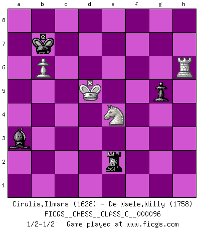 Last move : 1/2-1/2 2009 March 19 20:59:21 [Event "FICGS__CHESS__CLASS_C__000096"] [Site "FICGS"] [Date "2008.10.13"] [Round "1"] [White "Cirulis,Ilmars"] [Black "De Waele,Willy"] [Result "1/2-1/2"] [WhiteElo "1628"] [BlackElo "1758"] 1.c4 e5 2.g3 Nf6 3.Nc3 d5 4.cxd5 Nxd5 5.Bg2 Nb6 6.d3 Be7 7.Be3 O-O 8.Qc2 Nc6 9.Bxc6 bxc6 10.Nf3 f6 11.O-O Nd5 12.d4 Bh3 13.Rfd1 Nxe3 14.fxe3 exd4 15.Nxd4 Qe8 16.e4 Bd6 17.Rd2 c5 18.Nf3 Rb8 19.Rad1 Qd7 20.b3 Qf7 21.Nd5 Rbe8 22.Qc4 Kh8 23.Qc2 Bg4 24.Qc4 Bh5 25.Nh4 c6 26.Ne3 Qxc4 27.Nxc4 Bb8 28.e5 fxe5 29.Rf1 Rxf1+ 30.Kxf1 Bg4 31.e4 g6 32.Kg2 Bc7 33.h3 Be6 34.Nf3 Kg7 35.g4 a5 36.Ng5 Bc8 37.Nf3 Re6 38.Nb2 Rf6 39.Rc2 Ba6 40.Rxc5 Be2 41.Nh2 Rf4 42.Rxc6 Bd8 43.Rc8 Bh4 44.Rc2 Rxe4 45.Nf3 Be7 46.Kf2 Bb5 47.Nc4 a4 48.Nfxe5 Kf6 49.Nd3 h6 50.Kf3 Bc6 51.Kg3 axb3 52.axb3 Bb7 53.Rc1 g5 54.Kf2 Ba6 55.Rc2 Bb5 56.Kf3 Re6 57.Ra2 Bc6+ 58.Kf2 Be4 59.Ke3 Bg2 60.Kd4 Re4+ 61.Kc3 Bxh3 62.Nf2 Rf4 63.Nxh3 Rf3+ 64.Kd4 Rxh3 65.Ra6+ Kg7 66.Ne3 Kf7 67.Nd5 Bf8 68.Rb6 Rg3 69.Ke5 Rg1 70.b4 Rxg4 71.Kf5 Rc4 72.b5 Rc2 73.Rb7+ Ke8 74.b6 Kd8 75.Rh7 Kc8 76.Nf6 Ba3 77.Rxh6 Rf2+ 78.Ke6 Re2+ 79.Kd5 Kb7 80.Ne4 1/2-1/2 English Opening Kingside Castling by player Black (move 7) Kingside Castling by player White (move 11) 10 pieces endgame at move 64 : White KRNPP , Black KRBPP WHITE : King + 1 Rook 1 Knight 2 Pawns BLACK : King + 1 Rook 1 Bishop 2 Pawns 9 pieces endgame at move 70 : White KRNP , Black KRBPP WHITE : King + 1 Rook 1 Knight 1 Pawn BLACK : King + 1 Rook 1 Bishop 2 Pawns 8 pieces endgame at move 77 : White KRNP , Black KRBP WHITE : King + 1 Rook 1 Knight 1 Pawn BLACK : King + 1 Rook 1 Bishop 1 Pawn This chess game ended in a draw. Follow this game move after move (download)Bobby Fischer's current state of mind is indeed a tragedy. One of the world's greatest Chess players - the pride and sorrow of American Chess. (Frank Brady) Woher wissen wir, daß der Neanderthaler Blindschach gespielt hat? -- Bei Ausgrabungen wurden keine Schachbretter und Figuren gefunden. (Anonymous) El poder defensivo de una pieza clavada, solamente es imaginario. (Aaron Nimzovich) Il a essayé de se convaincre qu'il pourrait empêcher toutes les erreurs et ne jamais perdre. L'horreur ! Gary Kasparov au sujet de Robert Fischer. Don't be discouraged. It's often the last key in the bunch that opens the lock. (Author unknown)