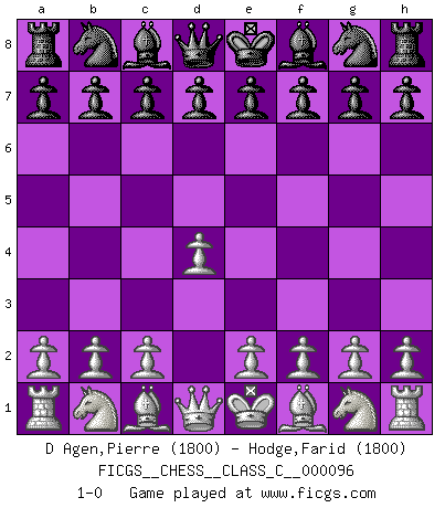 Last move : 1-0 2008 November 29 22:30:7 [Event "FICGS__CHESS__CLASS_C__000096"] [Site "FICGS"] [Date "2008.10.13"] [Round "1"] [White "D Agen,Pierre"] [Black "Hodge,Farid"] [Result "1-0"] [WhiteElo "1800"] [BlackElo "1800"] 1.d4 1-0 This chess game has been lost on time (started : 2008.10.13 12:26:54) Queen's pawn Player White won this chess game. Follow this game move after move (download)Nowadays, when you're not a grandmaster at 14, you can forget about it. (Anand Viswanathan) Nie in meinem Leben habe ich die französische Verteidigung gespielt, welche die Stumpfsinnigste von allen ist. (Wilhelm Steinitz) No solamente yo pronostico su triunfo sobre Botvinnik, sino que me adelanto y digo que probablemente Fischer es el jugador de Ajedrez mas grande que haya existido. (John Collins) Ne tendez aucun piège pour le plaisir ! Ne jouez rien dans l'espoir que l'adversaire réagisse de façon stupide ! Prenez toujours pour acquis que l'adversaire va trouver le meilleur coup ! Ne jouez jamais de coup dans l'espoir que l'adversaire ne voie pas la menace ! Chacun de vos coups doit améliorer la position d'une façon ou d'une autre. It is a good thing for an uneducated man to read books of quotations. (Winston Churchill)