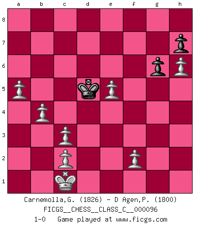 Last move : 1-0 2009 March 11 23:57:19 [Event "FICGS__CHESS__CLASS_C__000096"] [Site "FICGS"] [Date "2008.10.13"] [Round "1"] [White "Carnemolla,Giampaolo"] [Black "D Agen,Pierre"] [Result "1-0"] [WhiteElo "1826"] [BlackElo "1800"] 1.e4 Nf6 2.e5 Nd5 3.Nc3 Nxc3 4.dxc3 Nc6 5.Bf4 e6 6.Qd2 Be7 7.O-O-O O-O 8.Nf3 f6 9.exf6 Bxf6 10.Kb1 d6 11.h4 e5 12.Bc4+ Kh8 13.Be3 Bg4 14.Bd5 a5 15.h5 Rb8 16.h6 g6 17.a3 Ne7 18.Be4 d5 19.Bxd5 Nxd5 20.Qxd5 Qxd5 21.Rxd5 Bxf3 22.gxf3 Rbd8 23.Rxa5 b6 24.Ra7 Rd7 25.Bxb6 R8f7 26.Bxc7 Bd8 27.Ra8 Rf8 28.Bxd8 R7xd8 29.Rxd8 Rxd8 30.Kc1 Kg8 31.a4 Kf7 32.a5 Ke6 33.Rh4 Kd5 34.b4 Kc6 35.Re4 Re8 36.f4 Kd5 37.Rxe5+ Rxe5 38.fxe5 1-0 Alekhine's defense : Saemisch attack Queenside Castling by player White (move 7) Kingside Castling by player Black (move 7) Player White won this chess game. Follow this game move after move (download)There are two types of sacrifices: correct ones and mine. (Mikhail Tal) Schach ist Leben. (Robert James Fischer) La única cosa que los jugadores de Ajedrez tienen en común, es el Ajedrez. (Lodewijk Prins) Les Echecs sont et restent toujours un combat, un combat intégral comme la boxe, la lutte ou un autre sport, et où il doit y avoir un vainqueur et un vaincu. (Joseph Emil Diemer) Follow your passion, and success will follow you. (Arthur Buddhold)