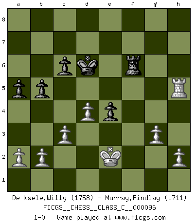 Last move : 1-0 2008 December 23 10:35:0 [Event "FICGS__CHESS__CLASS_C__000096"] [Site "FICGS"] [Date "2008.10.13"] [Round "1"] [White "De Waele,Willy"] [Black "Murray,Findlay"] [Result "1-0"] [WhiteElo "1758"] [BlackElo "1711"] 1.e4 e5 2.Nf3 Nc6 3.Bb5 f5 4.Nc3 fxe4 5.Nxe4 d5 6.Nxe5 dxe4 7.Nxc6 Qg5 8.Qe2 Nf6 9.f4 Qxf4 10.Ne5 c6 11.d4 Qh4+ 12.g3 Qh3 13.Bc4 Be6 14.Bf4 O-O-O 15.O-O-O Bd6 16.Kb1 Rhf8 17.Rhf1 Bc7 18.Bxe6+ Qxe6 19.c3 h6 20.Ng6 Rfe8 21.Rde1 Nd5 22.Bxc7 Kxc7 23.Ne5 Nf6 24.Nc4 Nd5 25.Ne3 Rf8 26.Ng4 Rxf1 27.Rxf1 Nf6 28.Nxf6 gxf6 29.Qe3 h5 30.Qf4+ Rd6 31.Re1 f5 32.Rf1 a5 33.Qxf5 Qxf5 34.Rxf5 Re6 35.Kc1 b5 36.Kd2 Kd6 37.Rxh5 Rf6 38.Ke2 1-0 Ruy Lopez : Schliemann defense, Berger variation Queenside Castling by player Black (move 14) Queenside Castling by player White (move 15) Player White won this chess game. Follow this game move after move (download)The passed pawn is a criminal, who should be kept under lock and key. Mild measures, such as police surveillance, are not sufficient. (Nimzovitch) Ich habe kein Problem mit Frauen, sondern nur mit dem Niveau ihres Schachspiels (Judith Polgar) Fischer es el jugador mas fuerte del mundo. De hecho, el jugador mas fuerte que jamas haya existido. (Larry Evans) Karpov est une pièce de musée. (Garry Kasparov) Always two there are. No more no less. A master, and an apprentice. (Master Yoda in Star Wars ep.1)