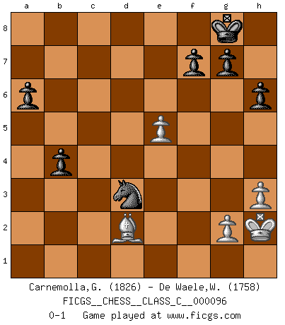 Last move : 0-1 2009 June 15 22:43:38 [Event "FICGS__CHESS__CLASS_C__000096"] [Site "FICGS"] [Date "2008.10.13"] [Round "1"] [White "Carnemolla,Giampaolo"] [Black "De Waele,Willy"] [Result "0-1"] [WhiteElo "1826"] [BlackElo "1758"] 1.e4 c5 2.Nf3 d6 3.d4 cxd4 4.Nxd4 Nf6 5.Nc3 a6 6.Be2 e5 7.Nb3 Be7 8.O-O O-O 9.Be3 Be6 10.f3 Nbd7 11.a4 Qc7 12.Qd2 h6 13.a5 Rac8 14.Bd3 Rfd8 15.Qf2 d5 16.exd5 Nxd5 17.Nxd5 Bxd5 18.Bf5 Qc6 19.Rad1 Be6 20.Bxe6 Qxe6 21.Rd3 Nf6 22.Rxd8+ Bxd8 23.Rd1 Nd5 24.Bc5 Nf4 25.Rd2 Qc4 26.Be3 Nd5 27.Re2 Nb4 28.Nc5 Be7 29.Nd7 Qb5 30.Nb6 Rc6 31.b3 Qxa5 32.h3 Qa2 33.Nc4 b5 34.Nxe5 Rxc2 35.Rxc2 Nxc2 36.Bf4 Qxb3 37.Qa7 Qe6 38.Qb8+ Bf8 39.Qd8 Qe7 40.Qd3 Nb4 41.Qd2 Qd6 42.Qb2 Qd1+ 43.Kh2 Bc5 44.Bd2 Bf2 45.Qc1 Qxc1 46.Bxc1 Bd4 47.f4 Bxe5 48.fxe5 Nd3 49.Bd2 b4 0-1 Sicilian : Najdorf, Opovcensky variation Kingside Castling by player White (move 8) Kingside Castling by player Black (move 8) Player Black won this chess game. Follow this game move after move (download)I guess a certain amount of temperament is expected of Chess geniuses. (Ron Gross) Gewöhnliche Menschen denken nur daran, wie sie ihre Zeit verbringen. Ein intelligenter Mensch versucht, sie auszunutzen. (Arthur Schopenhauer) En el Ajedrez, tal como es jugado por los Maestros, practicamente la suerte es eliminada. (Emanuel Lasker) Je menace de comprendre la position. (Anonyme) Only sick music makes money today. (Friedrich Nietzsche)