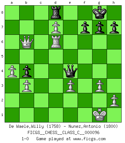 Last move : 1-0 2008 November 17 12:6:7 [Event "FICGS__CHESS__CLASS_C__000096"] [Site "FICGS"] [Date "2008.10.13"] [Round "1"] [White "De Waele,Willy"] [Black "Nunez,Antonio"] [Result "1-0"] [WhiteElo "1758"] [BlackElo "1800"] 1.e4 e5 2.Nf3 Nc6 3.Bb5 a6 4.Ba4 Nf6 5.O-O Be7 6.Re1 b5 7.Bb3 O-O 8.c3 d5 9.exd5 Nxd5 10.Nxe5 Nxe5 11.Rxe5 c6 12.d4 Bd6 13.Re1 Qh4 14.g3 Qh3 15.Be3 Re8 16.Bxd5 cxd5 17.Qf3 Ra7 18.Nd2 Rae7 19.a4 b4 20.c4 dxc4 21.Nxc4 Bb7 22.d5 Bc7 23.Red1 Re4 24.Rac1 Rh4 25.Qh1 Rh5 26.Bc5 a5 27.Ne3 Bd8 28.Qg2 Qd7 29.b3 Rhe5 30.Qf1 Bc8 31.Bd4 Re4 32.Qb5 Qh3 33.Bb6 Bg5 34.d6 Bxe3 35.Bxe3 Bd7 36.Qxa5 Bg4 37.Qb5 Bxd1 38.d7 Rd8 39.Rxd1 Qg4 40.Rd6 Rxe3 41.fxe3 Qe4 42.Qb6 1-0 Ruy Lopez : Closed, 7...O-O Kingside Castling by player White (move 5) Kingside Castling by player Black (move 7) Player White won this chess game. Follow this game move after move (download)A passed Pawn increases in strength as the number of pieces on the board diminishes. (Capablanca) Kasparov ist eine Art Monster mit hundert Augen, denen auch nicht das Geringste entgeht. (Tony Miles) El poder defensivo de una pieza clavada, solamente es imaginario. (Aaron Nimzovich) L'action d'une oeuvre littéraire se déroule sur un champ de bataille. Les masques et les types du drame moderne correspondent aux pièces du jeu d'échecs. L'intrigue correspond aux coups et aux gambits, c'est à dire aux techniques du jeu telles qu'utilisées et interprétées par les joueurs. Les tactiques et les péripéties [mouvements] correspondent aux coups exécutés par l'adversaire. (Viktor Shklovsky) The hypothalamus is one of the most important parts of the brain, involved in many kinds of motivation, among other functions. The hypothalamus controls the 'Four Fs: Fighting, Fleeing, Feeding and Mating. (Unknown author)