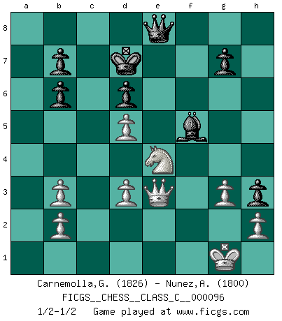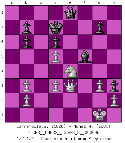 Last move : 1/2-1/2 2009 June 4 1:45:45 [Event "FICGS__CHESS__CLASS_C__000096"] [Site "FICGS"] [Date "2008.10.13"] [Round "1"] [White "Carnemolla,Giampaolo"] [Black "Nunez,Antonio"] [Result "1/2-1/2"] [WhiteElo "1826"] [BlackElo "1800"] 1.e4 e5 2.Nf3 Nc6 3.Bc4 Nf6 4.Ng5 Bc5 5.Bxf7+ Ke7 6.Bb3 d6 7.Nc3 Rf8 8.O-O Qe8 9.Nd5+ Nxd5 10.exd5 Nd4 11.c3 Nxb3 12.axb3 h6 13.Ne4 Qg6 14.Qe1 Bb6 15.d3 Kf7 16.Be3 Bd7 17.Bxb6 axb6 18.f4 exf4 19.Rxf4+ Kg8 20.Rxf8+ Rxf8 21.c4 Bf5 22.Qe3 Re8 23.Re1 Ra8 24.Qd4 Ra2 25.g3 h5 26.Nf2 Qg5 27.Kg2 Kf7 28.Ne4 Qg4 29.Qf2 h4 30.Kh1 h3 31.Nc3 Ra8 32.Nb5 Re8 33.Rxe8 Kxe8 34.Nc3 Qg6 35.Qe2+ Kd7 36.Ne4 c6 37.Kg1 cxd5 38.cxd5 Qe8 39.Qe3 1/2-1/2 Two knights defense : Wilkes Barre (Traxler) variation Kingside Castling by player White (move 8) This chess game ended in a draw. Follow this game move after move (download)I won't play with you anymore. You have insulted my friend. - When an opponent cursed himself for a blunder. (Miguel Najdorf) Warum muß ich gegen diesen IDIOTEN verlieren? (Aaron Nimzowitsch) Yo no creo en la psicología. Yo creo en las buenas movidas. (Bobby Fischer) Echiquier : carré parfait, comme la Jérusalem nouvelle décrite par l'auteur de l'Apocalypse, huit cases sur huit, exaltation du chiffre 4, symbole du cosmos aux quatre horizons... où le noir et le blanc, l'ombre et la lumière, le mal et le bien s'entremêlent et se conjuguent. (Robert Couffignal, Le Gambit du poète) Pushing plastic is for the many, pushing virtual pieces is for the fewer, pushing wood is for the very few. (Normajean Yates)