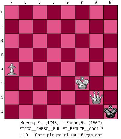 Last move : 1-0 2009 May 6 1:20:7 [Event "FICGS__CHESS__BULLET_BRONZE__000119"] [Site "FICGS"] [Date "2009.05.06"] [Round "1"] [White "Murray,Findlay"] [Black "Raman,Ranganathan"] [Result "1-0"] [WhiteElo "1746"] [BlackElo "1662"] 1.c4 e5 2.e4 Qf6 3.d3 Nc6 4.g3 Bc5 5.Qf3 Nd4 6.Qxf6 Nxf6 7.Kd1 d6 8.Be3 Bg4+ 9.Kd2 Bb4+ 10.Kc1 Nf3 11.Nxf3 Bxf3 12.Rg1 c5 13.a3 Ba5 14.Bg2 Be2 15.Bf1 Bh5 16.Nc3 Bxc3 17.bxc3 b6 18.h3 Bg6 19.f4 h5 20.Kd2 Nd7 21.d4 f6 22.f5 Bf7 23.d5 g5 24.Be2 Ke7 25.Rab1 Rag8 26.a4 a5 27.g4 hxg4 28.hxg4 Rh2 29.Kd3 Rgh8 30.Ra1 R8h3 31.Bf1 Rh4 32.Be2 Kd8 33.Bf1 Kc7 34.Be2 Be8 35.Bf1 Nf8 36.Rg3 Bd7 37.Bg1 Rb2 38.Be3 Rh1 39.Rg1 R1h2 40.Ra3 Bc8 41.Rg3 Nd7 42.Rg1 Rb1 43.Be2 Rb2 44.Bf1 Nb8 45.Rg3 Na6 46.Rh3 Rxh3 47.Bxh3 Kb8 48.Ra1 Rh2 49.Bf1 Rh1 50.Ke2 Nc7 51.Kf2 Ba6 52.Kg2 Rh6 53.Be2 Ne8 54.Rb1 Kc7 55.Rh1 Rxh1 56.Kxh1 Ng7 57.Kg2 b5 58.cxb5 Bxb5 59.Bxb5 Kb6 60.Kf2 Kc7 61.Ke2 Kd8 62.Kd2 Ne8 63.Kc2 Nc7 64.c4 Kc8 65.Bd2 Kb7 66.Bxa5 Nxb5 67.cxb5 Kb8 68.Bd8 Kb7 69.Bxf6 c4 70.Bxg5 Kb6 71.Be7 Kc5 72.g5 Kd4 73.Bxd6 Kxe4 74.Kc3 Kxd5 75.Bxe5 Kxe5 76.Kxc4 Kxf5 77.b6 Kxg5 78.b7 Kf5 79.b8Q Ke4 80.Qe8+ Kf5 81.Kd4 Kf6 82.Kd5 Kf5 83.Qf8+ Kg4 84.Ke5 Kg3 85.Ke4 Kg2 86.Ke3 Kg3 87.Qg8+ Kh2 88.Kf3 Kh1 89.Qg2+ 1-0 English Opening 10 pieces endgame at move 73 : White KBPPPPP , Black KPP WHITE : King + 1 Bishop 5 Pawns BLACK : King + 2 Pawns 9 pieces endgame at move 74 : White KBPPPP , Black KPP WHITE : King + 1 Bishop 4 Pawns BLACK : King + 2 Pawns 8 pieces endgame at move 75 : White KBPPPP , Black KP WHITE : King + 1 Bishop 4 Pawns BLACK : King + 1 Pawn 7 pieces endgame at move 75 : White KPPPP , Black KP WHITE : King + 4 Pawns BLACK : King + 1 Pawn 6 pieces endgame at move 76 : White KPPPP , Black K WHITE : King + 4 Pawns BLACK : King + 5 pieces endgame at move 76 : White KPPP , Black K WHITE : King + 3 Pawns BLACK : King + 4 pieces endgame at move 77 : White KPP , Black K WHITE : King + 2 Pawns BLACK : King + Promotion Queen by player White (move 79) Player White won this chess game. Follow this game move after move (download)First-class players lose to second class players because second-class players sometimes play a first-class game. (Tarrasch) Die FIDE ist dabei in die Hände der russischen Mafia zu fallen. (Larry Evans) No es tiempo de jugar al Ajedrez cuando la casa esta en llamas. (Proverbio Italiano) Les ravages du H expliquent la différence de niveau entre Tal et Thal [Abergel]. Good decisions come from experience, and experience comes from bad decisions. (Anonymous)