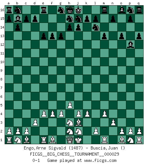 Last move : 0-1 2009 January 22 19:29:26 [Event "FICGS__BIG_CHESS__TOURNAMENT__000029"] [Site "FICGS"] [Date "2008.10.16"] [Round "1"] [White "Engo,Arne Sigvald"] [Black "Buscia,Juan"] [Result "0-1"] [WhiteElo "1487"] [BlackElo ""] 1.h3-h4 g15-g13 2.j3-j4 f15-f13 3.g1-h3 e15-e13 4.k1-j3 f16-c13 5.n2-n3 k16-l14 6.d2-d3 m15-m13 7.m2-m4 l16-p12 8.g2-g4 q15-q13 9.k2-k4 b15-b14 10.h4-h5 c13-a11 11.f2-f4 c16-b15 12.e2-e4 a11-j3 13.l1-j3 o15-o13 0-1 This big chess game has been lost on time (started : 2008.10.16 9:58:34) Follow this game move after move (download)A Chess game is divided into three stages: the first, when you hope you have the advantage, the second when you believe you have an advantage, and the third... when you know you're going to lose ! (Savielly Tartakower) Offener Brief an US-Präsident Bush anlässlich der Verhaftung Bobby Fishers: Verhaften Sie mich. Stecken Sie mich in dieselbe Zelle wie Bobby Fisher und geben Sie uns ein Schachspiel mit. (Boris Vassilievich Spassky) Yo adoro todas la posiciones. Denme una partida posicional difícil, y la jugaré. Pero posiciones totalmente ganadas, no las tolero. (Hein Donner) Pour se monter efficace, un Cavalier a besoin d'avant-postes ! Les Cavaliers font les meilleurs bloqueurs de pions passés. True nature is revealed in times of difficulty. (Chinese proverb)