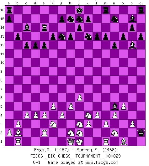 Last move : 0-1 2009 January 26 19:53:39 [Event "FICGS__BIG_CHESS__TOURNAMENT__000029"] [Site "FICGS"] [Date "2008.10.16"] [Round "1"] [White "Engo,Arne Sigvald"] [Black "Murray,Findlay"] [Result "0-1"] [WhiteElo "1487"] [BlackElo "1468"] 1.j3-j4 j15-k13 2.h3-h4 h15-g13 3.k1-j3 c15-c13 4.g1-h3 b15-b13 5.g2-g3 c16-b15 6.k2-k3 e15-e13 7.c2-c4 p15-p14 8.o2-o4 h16-o10 9.p2-p3 b15-q1 10.m2-m3 q1-b15 11.d2-d4 o16-p15 12.e2-e3 m15-m13 13.n2-n4 d15-d13 14.b2-b3 o10-q8 15.l1-k2 q8-q2 16.p1-n2 d13-d12 17.c1-b2 f16-d14 18.f2-f4 b16-c14 19.b1-d2 l16-p12 20.l2-l4 g16-j15 21.h4-h5 o15-o13 22.d2-f3 n15-n13 23.j4-j5 n13-n12 24.h3-k4 p16-n15 25.g3-g4 l15-l13 26.j5-j6 k16-h15 27.f1-l6 f15-f13 28.e3-e4 h14-h13 29.o4-o5 q15-q13 30.l6-d13 e13-e12 31.e1-e2 c13-c12 32.a1-b1 e16-e13 33.d13-c14 b15-c14 34.k2-n5 e13-e14 35.f4-f5 d14-n5 0-1 This big chess game has been lost on time (started : 2008.10.16 9:58:34) Follow this game move after move (download)What is the object of playing a gambit opening?... To acquire a reputation of being a dashing player at the cost of losing a game. (Siegbert Tarrasch) Immer nach dem besten Zug zu suchen ist ziemlich unpraktisch. (Nigel Short) Buenas posiciones no logran ganar juegos, buenas movidas sí. (Gerald Abrahams) Le profane ne songe pas à la somme de jouissance dont il se prive, qui méconnaît ce jeu aux ressources aussi variées que passionnantes. (Jean-Marie Jeanton-Lamarche) Man is reluctant to give credit for intelligence to anyone, except his enemies. (Albert Einstein)