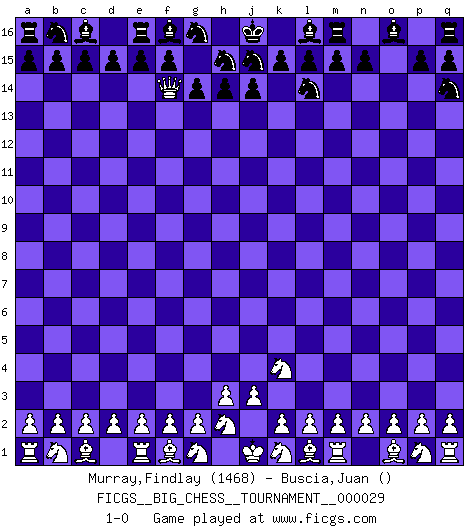 Last move : 1-0 2008 December 13 2:20:28 [Event "FICGS__BIG_CHESS__TOURNAMENT__000029"] [Site "FICGS"] [Date "2008.10.16"] [Round "1"] [White "Murray,Findlay"] [Black "Buscia,Juan"] [Result "1-0"] [WhiteElo "1468"] [BlackElo ""] 1.j2-k4 k16-l14 2.h1-o7 g15-g14 3.o7-o15 p16-q14 4.o15-f7 h16-f14 5.f7-f14 1-0 This big chess game has been lost on time (started : 2008.10.16 9:58:34) Follow this game move after move (download)Fischer is completely natural. He plays no roles. He's like a child. Very, very simple. (Zita Rajcsanyi) Die Leute spielen gegen mich seit 15 Jahren unter Ihren Möglichkeiten. (Robert James Fischer) Fischer es el jugador mas fuerte del mundo. De hecho, el jugador mas fuerte que jamas haya existido. (Larry Evans) Les échecs, c'est l'art d'analyser. (Mikhail Botvinnik) The leaves of memory seemed to make a mournful rustling in the dark. (Henry Wadsworth Longfellow)