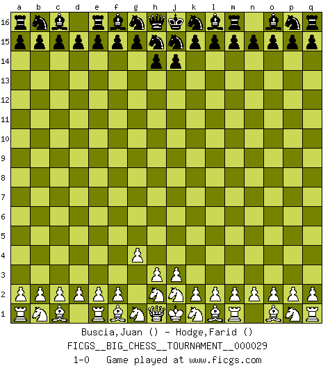 Last move : 1-0 2008 November 23 21:54:1 [Event "FICGS__BIG_CHESS__TOURNAMENT__000029"] [Site "FICGS"] [Date "2008.10.16"] [Round "1"] [White "Buscia,Juan"] [Black "Hodge,Farid"] [Result "1-0"] [WhiteElo ""] [BlackElo ""] 1.g2-g4 1-0 This big chess game has been lost on time (started : 2008.10.16 9:58:34) Follow this game move after move (download)Live, lose, and learn, by observing your opponent how to win. (Amber Steenbock) Modernes Schach erfordert enorme Anspannung. Es ist für einen normalen Menschen unmöglich das auszuhalten. (Viktor Kortschnoi) Tu sabes, camarada Pachman, no disfruto el ser un Ministro, preferería jugar al Ajedrez como tu. (Che Guevara) Je crois qu'il existe des manières très spécifiques de jouer efficacement contre une machine. Evidemment, nous n'avons aucune chance en technique pure, parce que l'ordinateur calcule de manière parfaite. Mais lorsque nous faisons appel à notre cerveau, en utilisant l'intuition et la compréhension, alors nous restons beaucoup plus forts. (Anatoli Karpov) God is an atheist. (Unknown)