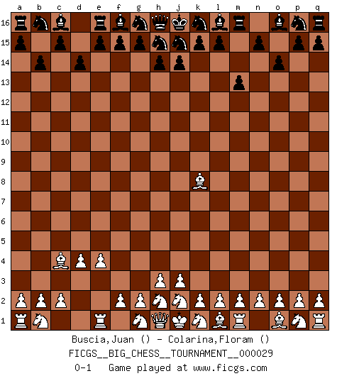 Last move : 0-1 2008 November 30 10:33:14 [Event "FICGS__BIG_CHESS__TOURNAMENT__000029"] [Site "FICGS"] [Date "2008.10.16"] [Round "1"] [White "Buscia,Juan"] [Black "Colarina,Floram"] [Result "0-1"] [WhiteElo ""] [BlackElo ""] 1.e2-e4 m15-m13 2.d2-d4 b15-b14 3.c1-k8 d15-d14 4.f1-c4 o15-o14 0-1 This big chess game has been lost on time (started : 2008.10.16 9:58:34) Follow this game move after move (download)No other master has such a terrific will to win. At the board he radiates danger, and even the strongest opponents tend to freeze, like rabbits when they smell a panther. Even his weaknesses are dangerous. As white, his opening game is predictable - you can make plans against it - but so strong that your plans almost never work. In the middle game his precision and invention are fabulous, and in the end game you simply cannot beat him. (Anonymous German Expert) Frage des Reporters: -Worin besteht das Ziel von Gambiteröffnungen? Antwort: -Auf Kosten der Partie einen Ruf als Angriffspieler zu erwerben.- (Siegbert Tarrasch) Después de la respuesta de las negras a 1.e4 con 1..e5, se quedan siempre tratando de entrar dentro del juego. (Howard Staunton) Comme les marins qui ont mille raisons différentes d'aller en mer, les joueurs d'échecs en ont tout autant avant de s'installer devant une table et jouer... (Vincent Bertignac, philosophe) Everybody lies. (Gregory House, House M.D.)