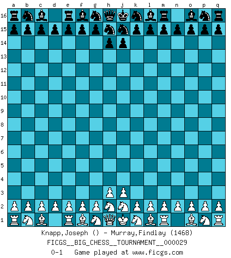 Last move : 0-1 2008 November 22 9:44:2 [Event "FICGS__BIG_CHESS__TOURNAMENT__000029"] [Site "FICGS"] [Date "2008.10.16"] [Round "1"] [White "Knapp,Joseph"] [Black "Murray,Findlay"] [Result "0-1"] [WhiteElo ""] [BlackElo "1468"] 0-1 This big chess game has been lost on time (started : 2008.10.16 9:58:34) Follow this game move after move (download)We like to think. (Gary Kasparov) Auf Remis zu spielen ist gewissermaßen ein Verbrechen gegen das Schachspiel. (Mikhail Nekhemyevich Tal) El Ajedrez es como la guerra en un tablero. (Bobby Fischer) Des combinaisons [dans le jeu d'échecs] pareilles à des mélodies. Je crois entendre pour ainsi dire la musique des coups... (Vladimir Nabokov) There is a very easy way to return from a casino with a small fortune : go there with a large one. (Jack Yelton)
