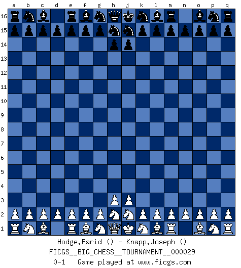 Last move : 0-1 2008 November 22 9:44:2 [Event "FICGS__BIG_CHESS__TOURNAMENT__000029"] [Site "FICGS"] [Date "2008.10.16"] [Round "1"] [White "Hodge,Farid"] [Black "Knapp,Joseph"] [Result "0-1"] [WhiteElo ""] [BlackElo ""] 0-1 This big chess game has been lost on time (started : 2008.10.16 9:58:34) Follow this game move after move (download)Could we look into the head of a Chess player, we should see there a whole world of feelings, images, ideas, emotion and passion. (Alfred Binet) Ein Teil des Fehlers ist immer korrekt. (Savielly Grigorievitsch Tartakower) El Ajedrez moderno está demasiado preocupado con cosas como la estructura de Peones. Olvidenlo, el Jaque Mate termina la partida. (Nigel Short) La victoire dans une partie d'Echecs appartient la plupart du temps à celui qui voit un peu plus loin que l'adversaire. (Lasker) Patience, use the Force, think ! (Obi-Wan Kenobi in Star Wars ep.2)