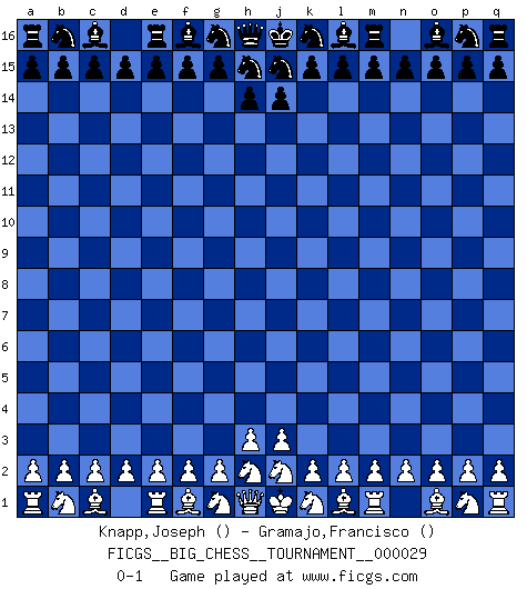 Last move : 0-1 2008 November 22 9:44:2 [Event "FICGS__BIG_CHESS__TOURNAMENT__000029"] [Site "FICGS"] [Date "2008.10.16"] [Round "1"] [White "Knapp,Joseph"] [Black "Gramajo,Francisco"] [Result "0-1"] [WhiteElo ""] [BlackElo ""] 0-1 This big chess game has been lost on time (started : 2008.10.16 9:58:34) Follow this game move after move (download)Chess is 99 percent tactics. (Teichmann) Ich erzeugte keinen Neid, da mich die Schachspieler als Musiker und die Musiker als Schachspieler betrachteten. (Mark Taimanov) El Ajedrez es un juego terrible. Si no dominas el centro, tu oponente tiene una posición mas libre. Si tu tienes el centro, entonces realmente tienes algo de que preocuparte. (Siegbert Tarrasch) Je menace de comprendre la position. (Anonyme) Ah, beer! The cause of, and the solution to, all of life's problems. (Homer Simpson)
