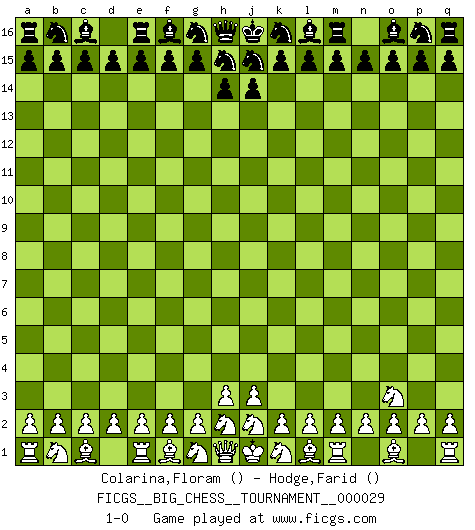 Last move : 1-0 2008 November 22 21:45:21 [Event "FICGS__BIG_CHESS__TOURNAMENT__000029"] [Site "FICGS"] [Date "2008.10.16"] [Round "1"] [White "Colarina,Floram"] [Black "Hodge,Farid"] [Result "1-0"] [WhiteElo ""] [BlackElo ""] 1.p1-o3 1-0 This big chess game has been lost on time (started : 2008.10.16 9:58:34) Follow this game move after move (download)That's what Chess is all about. One day you give your opponent a lesson, the next day he gives you one. (Bobby Fischer) Schach ist Krieg, im Schach geht es um testosterongesteuerte Urschreie. (Garry Kasparov) Del Ajedrez se ha dicho que la vida no es lo suficientemente larga para él, pero eso es culpa de la vida, no del Ajedrez. (William Ewart Napier) RxDa4 pat (...) A woman without a man is like a fish without a bicycle. (Gloria Steinem)