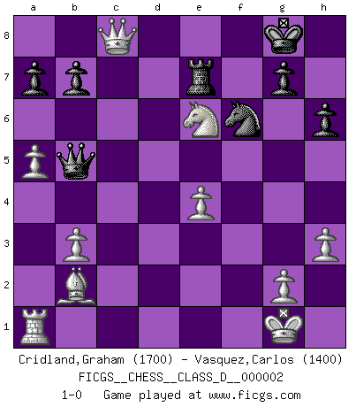 Last move : 1-0 2006 September 24 15:5:25 [Event "FICGS__CHESS__CLASS_D__000002"] [Site "FICGS"] [Date "2006.04.15"] [Round "1"] [White "Cridland,Graham"] [Black "Vasquez,Carlos"] [Result "1-0"] [WhiteElo "1700"] [BlackElo "1400"] 1.e4 e5 2.Nf3 d6 3.Bc4 h6 4.O-O Nf6 5.d3 Be7 6.c3 O-O 7.Nbd2 c5 8.Bb3 Nc6 9.Re1 Be6 10.Bxe6 fxe6 11.b3 Qb6 12.Nc4 Qd8 13.a4 Qc7 14.Bb2 Rad8 15.Qe2 Na5 16.Nxa5 Qxa5 17.Nd2 Qb6 18.a5 Qc6 19.Nc4 Ra8 20.h3 Qb5 21.Qc2 Nh5 22.d4 cxd4 23.cxd4 Rac8 24.Qd1 Nf6 25.dxe5 dxe5 26.Nxe5 Rcd8 27.Qc2 Bd6 28.Ng6 Bb4 29.Nxf8 Bxe1 30.Nxe6 Bxf2+ 31.Kxf2 Rd7 32.Kg1 Re7 33.Qc8+ 1-0 Philidor's defense Kingside Castling by player White (move 4) Kingside Castling by player Black (move 6) Player White won this chess game. Follow this game move after move (download)Chess is the art of analysis. (Mikhail Botvinnik) Wenn ein Kopf und ein Buch zusammenstoßen und es klingt hohl, ist es denn allemal im Buche? (Georg Christoph Lichtenberg) Tu eres para mi la Reina en d8 y yo soy el Peón en d7!!. (GM Eduard Gufeld) La guerre est enfant de la passion, la passion est enfant du narcissisme et le narcissisme est l'enfant. (...) Une autre partie ? (Thibault de Vassal) Waiting for chance ? Play in casinos. (FICGS proverb)