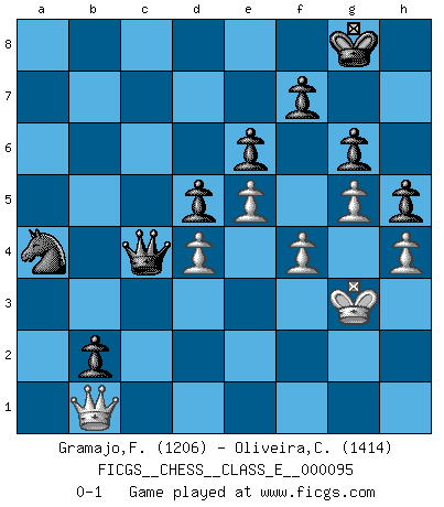 Last move : 0-1 2008 December 21 19:36:21 [Event "FICGS__CHESS__CLASS_E__000095"] [Site "FICGS"] [Date "2008.10.16"] [Round "1"] [White "Gramajo,Francisco"] [Black "Oliveira,Carlos"] [Result "0-1"] [WhiteElo "1206"] [BlackElo "1414"] 1.e4 c6 2.d4 d5 3.e5 Bf5 4.Bd3 Bxd3 5.Qxd3 Qa5+ 6.c3 Qa6 7.Qg3 e6 8.b4 Ne7 9.Bg5 Nd7 10.Ne2 Nf5 11.Qf3 h6 12.Bf4 Be7 13.O-O Nh4 14.Qe3 Nf5 15.Qf3 O-O 16.a4 b6 17.Nd2 c5 18.b5 Qb7 19.Nb3 c4 20.a5 Rfe8 21.a6 Qc7 22.Ng3 Nxg3 23.Bxg3 cxb3 24.Rab1 Qc4 25.Rb2 Qxb5 26.Rfb1 Qxa6 27.Rxb3 Qc4 28.h4 Rec8 29.Qe3 a6 30.f4 b5 31.Bf2 Nb6 32.g3 Na4 33.Be1 Rc7 34.Kh2 Rac8 35.Kh3 Bf8 36.g4 Qf1+ 37.Kg3 Be7 38.Bf2 Qc4 39.Be1 Rb7 40.g5 h5 41.Qf3 g6 42.Qf2 Rcb8 43.Bd2 a5 44.Qe3 b4 45.Qf3 Rb5 46.cxb4 Bxb4 47.Bxb4 Rxb4 48.Rxb4 Rxb4 49.Rxb4 axb4 50.Qd1 b3 51.Qb1 b2 0-1 Caro-Kann : Advance variation Kingside Castling by player White (move 13) Kingside Castling by player Black (move 15) Player Black won this chess game. Follow this game move after move (download)You need not play well - just help your opponent to play badly. (Genrikh Chepukaitis) Ich habe kein Problem mit Frauen, sondern nur mit dem Niveau ihres Schachspiels (Judith Polgar) El Ajedrez es de 30 a 40 por ciento psicología. Uno no cuenta con esto cuando se juega contra una computadora. No lo puedo confundir. (Judith Polgar) Le profane ne songe pas à la somme de jouissance dont il se prive, qui méconnaît ce jeu aux ressources aussi variées que passionnantes. (Jean-Marie Jeanton-Lamarche) It is not titles that honor men, but men that honor titles. (Niccolo Machiavelli)