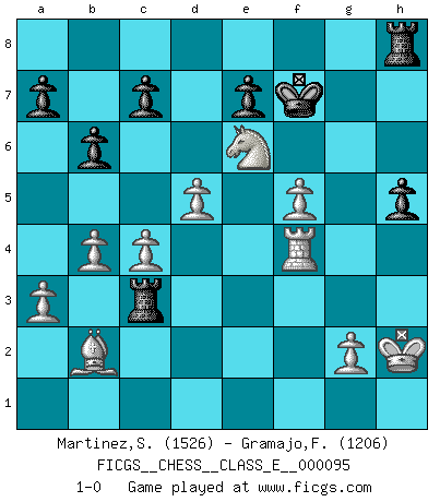 Last move : 1-0 2009 April 10 4:44:46 [Event "FICGS__CHESS__CLASS_E__000095"] [Site "FICGS"] [Date "2008.10.16"] [Round "1"] [White "Martinez,Silvio"] [Black "Gramajo,Francisco"] [Result "1-0"] [WhiteElo "1526"] [BlackElo "1206"] 1.d4 d5 2.Nc3 Nf6 3.Nf3 Bg4 4.Nh4 Nc6 5.h3 Be6 6.e3 g6 7.Bd3 Bg7 8.O-O O-O 9.a3 Qd7 10.b4 g5 11.Nf3 Ne4 12.Nxe4 g4 13.hxg4 Bxg4 14.Be2 dxe4 15.Nd2 Bxe2 16.Qxe2 f5 17.c4 Rf6 18.d5 f4 19.Nxe4 Rg6 20.exf4 Nd4 21.Qd3 Nf5 22.Nc5 Qc8 23.f3 b6 24.Ne6 Bxa1 25.Qxf5 Bf6 26.Qe4 Kf7 27.f5 Rg3 28.Qf4 Qg8 29.Rf2 h5 30.Qh6 Qh8 31.Qxh8 Rxh8 32.Kh2 Be5 33.f4 Rc3 34.Bb2 Bxf4+ 35.Rxf4 1-0 Queen's pawn : Chigorin variation Kingside Castling by player White (move 8) Kingside Castling by player Black (move 8) Player White won this chess game. Follow this game move after move (download)In Chess, just as in life, today's bliss may be tomorrow's poison. (Assaic) Der Bart als Geschlechtszeichen mitten im Gesicht ist obszön. Daher gefällt er den Weibern. [Zugegeben, kein Schachzitat, aber unglaublich originell] (Arthur Schopenhauer) Con el tiempo, empecé a progresar en partidas decisivas. Tal vez porque me di cuenta de una simple verdad: no solo estaba yo nervioso sino también mi oponente. (Mikhail Tal) Les Echecs ont trois composantes : le temps, l'espace et le matériel en dernier. (Mikhail Tal) The only sure thing about luck is that it will change. (Wilson Mizner)