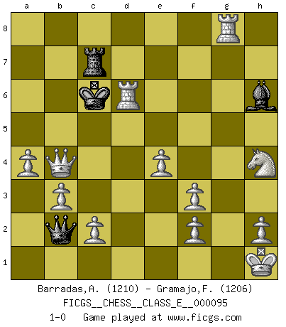 Last move : 1-0 2008 October 31 4:54:23 [Event "FICGS__CHESS__CLASS_E__000095"] [Site "FICGS"] [Date "2008.10.16"] [Round "1"] [White "Barradas,Anderson"] [Black "Gramajo,Francisco"] [Result "1-0"] [WhiteElo "1210"] [BlackElo "1206"] 1.e4 e5 2.Nf3 d6 3.d4 Bg4 4.Be2 Nd7 5.O-O Bxf3 6.Bxf3 h6 7.dxe5 Nxe5 8.b3 Nf6 9.Nc3 c6 10.Re1 b5 11.Bb2 a5 12.a4 b4 13.Ne2 Nxf3+ 14.gxf3 Nh5 15.Ng3 Nf4 16.Kh1 Qh4 17.Rg1 Nh3 18.Rg2 Nf4 19.Nf5 Qh5 20.Rg3 O-O-O 21.Qd2 f6 22.Qxf4 Qe8 23.Rd1 g5 24.Qg4 Kb8 25.Bxf6 h5 26.Qxg5 h4 27.Nxh4 Bh6 28.Qxa5 Rd7 29.Bxh8 Qxh8 30.Qb6+ Rb7 31.Qxc6 Qb2 32.Qxd6+ Rc7 33.Rg8+ Kb7 34.Qxb4+ Kc6 35.Rd6+ 1-0 Philidor's defense Kingside Castling by player White (move 5) Queenside Castling by player Black (move 20) Player White won this chess game. Follow this game move after move (download)In Fischer's hands, a slight theoretical advantage is as good a being a Queen ahead. (Isaac Kashdan) Ich kenne keine einzige Person, die behaupten würde, Garri Kasparow sei ein guter Mensch (Nigel Short) Después de la respuesta de las negras a 1.e4 con 1..e5, se quedan siempre tratando de entrar dentro del juego. (Howard Staunton) Il vaut toujours mieux jouer un plan faux de façon logique que de n'avoir pas de plan du tout. (Victor Kortchnoï) Mac users swear by their computers. PC users swear at their computers. (Author unknown)