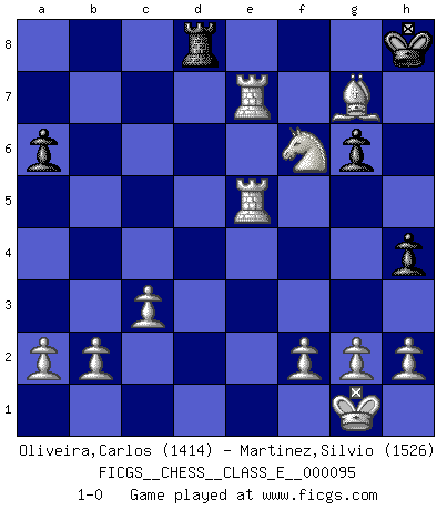 Last move : 1-0 2009 April 19 0:13:45 [Event "FICGS__CHESS__CLASS_E__000095"] [Site "FICGS"] [Date "2008.10.16"] [Round "1"] [White "Oliveira,Carlos"] [Black "Martinez,Silvio"] [Result "1-0"] [WhiteElo "1414"] [BlackElo "1526"] 1.e4 e5 2.Nf3 Nc6 3.Bb5 Nge7 4.O-O d5 5.exd5 Bd7 6.dxc6 Nxc6 7.Bxc6 Bxc6 8.Nxe5 Bc5 9.Nxc6 bxc6 10.c3 O-O 11.d4 Bd6 12.Nd2 Re8 13.Nf3 c5 14.Be3 cxd4 15.Nxd4 c5 16.Nf5 g6 17.Nxd6 Re6 18.Bxc5 f5 19.Qb3 Qd7 20.Rfe1 Kg7 21.Qxe6 Qxe6 22.Rxe6 h5 23.Rae1 a6 24.Bd4+ Kh6 25.Nxf5+ Kg5 26.Ng3 h4 27.R1e5+ Kh6 28.Be3+ Kg7 29.Re7+ Kf8 30.Bh6+ Kg8 31.Ne4 Rd8 32.Nf6+ Kh8 33.Bg7+ 1-0 Ruy Lopez : Cozio defense Kingside Castling by player White (move 4) Kingside Castling by player Black (move 10) Player White won this chess game. Follow this game move after move (download)By this measure (on the gap between Fischer & his contemporaries), I consider him the greatest world champion. (Garry Kasparov) Mein Name ist Rustam Kamsky. Sie haben meinen Sohn belästigt. Bereiten Sie sich aufs Sterben vor. (Rustam Kamsky) Cualquier cambio de material en una posición debe venir por medio de un mate, una captura o promoción de Peón. (Purdy) Je crois qu'il existe des manières très spécifiques de jouer efficacement contre une machine. Evidemment, nous n'avons aucune chance en technique pure, parce que l'ordinateur calcule de manière parfaite. Mais lorsque nous faisons appel à notre cerveau, en utilisant l'intuition et la compréhension, alors nous restons beaucoup plus forts. (Anatoli Karpov) . 'gn is not allowed in chess unless n is an integer between 1 and 8 inclusive, where 1 and 8 are to interpreted as the standard numerals standing for integers in the ordered real-closed field R, with the *canonical* ordering. (As opposed to, say, an integer in the domain Z[2+i*sqrt(5)] or an integer in some exotic Grothendieck topos). (Normajean Yates)
