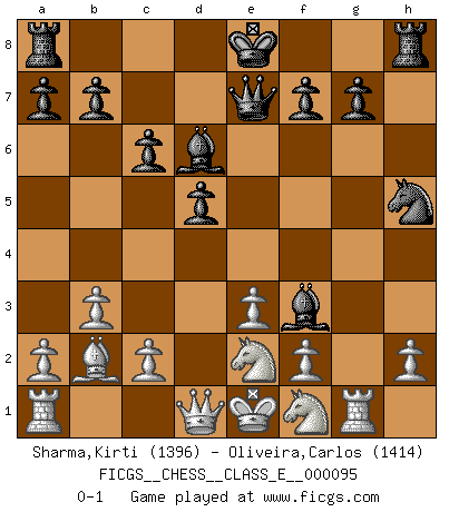 Last move : 0-1 2009 January 28 7:57:14 [Event "FICGS__CHESS__CLASS_E__000095"] [Site "FICGS"] [Date "2008.10.16"] [Round "1"] [White "Sharma,Kirti"] [Black "Oliveira,Carlos"] [Result "0-1"] [WhiteElo "1396"] [BlackElo "1414"] 1.g4 h5 2.gxh5 Nf6 3.Bg2 d5 4.e3 Bg4 5.Ne2 c6 6.d4 Nbd7 7.Nd2 e5 8.dxe5 Nxe5 9.b3 Bd6 10.Bb2 Qe7 11.Nf1 Nf3+ 12.Bxf3 Bxf3 13.Rg1 Nxh5 0-1 This chess game has been lost on time (started : 2008.10.16 23:23:26) Grob's attack Player Black won this chess game. Follow this game move after move (download)I had a toothache during the first game. In the second game I had a headache. In the third game it was an attack of rheumatism. In the fourth game, I wasn't feeling well. And in the fifth game? Well, must one have to win every game ? (Siegbert Tarrasch) Wenn Du absolut nicht mehr weißt, was Du tun sollst, dann ist es Zeit für Panik. (John van der Wiel) Debemos de asegurarnos de que el Ajedrez no se convierta en un lenguaje muerto, muy interesante, pero tan solo para un grupo muy pequeño. (Sytze Faber) Des combinaisons [dans le jeu d'échecs] pareilles à des mélodies. Je crois entendre pour ainsi dire la musique des coups... (Vladimir Nabokov) The arrogant army will lose certainly the battle. (Chinese proverb)
