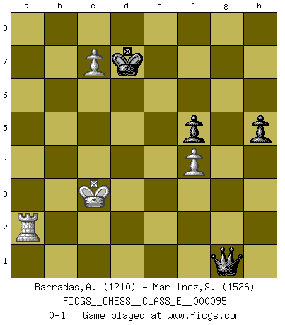 Last move : 0-1 2009 May 5 2:36:37 [Event "FICGS__CHESS__CLASS_E__000095"] [Site "FICGS"] [Date "2008.10.16"] [Round "1"] [White "Barradas,Anderson"] [Black "Martinez,Silvio"] [Result "0-1"] [WhiteElo "1210"] [BlackElo "1526"] 1.e4 e5 2.Nf3 Nc6 3.Bb5 Nge7 4.c3 a6 5.Ba4 b5 6.O-O bxa4 7.d4 d5 8.Re1 dxe4 9.Rxe4 Bb7 10.Be3 exd4 11.Nxd4 Nxd4 12.Rxd4 Nd5 13.c4 Bc5 14.Re4+ Ne7 15.Qxd8+ Rxd8 16.Rxe7+ Kxe7 17.Bxc5+ Ke6 18.Nc3 Bc6 19.Re1+ Kf6 20.b3 axb3 21.axb3 g5 22.Be7+ Kg6 23.Bxd8 Rxd8 24.g3 f5 25.Re6+ Kf7 26.Rxc6 a5 27.Rxc7+ Kg6 28.Ra7 Rd3 29.Nd5 h5 30.f4 g4 31.b4 axb4 32.Nxb4 Rd1+ 33.Kf2 Rd2+ 34.Ke3 Rxh2 35.c5 Rh3 36.Ra6+ Kf7 37.Kf2 Rh2+ 38.Kg1 Rb2 39.Nd5 Rb1+ 40.Kf2 Rb2+ 41.Ke1 Rb1+ 42.Kd2 Rb2+ 43.Kc3 Rg2 44.c6 Rxg3+ 45.Kd4 Rg1 46.Ra7+ Ke6 47.c7 Rd1+ 48.Kc4 Rc1+ 49.Nc3 Kd7 50.Kd3 g3 51.Kd2 Rxc3 52.Kxc3 g2 53.Ra2 g1Q 0-1 Ruy Lopez : Cozio defense Kingside Castling by player White (move 6) 10 pieces endgame at move 44 : White KRNPP , Black KRPPP WHITE : King + 1 Rook 1 Knight 2 Pawns BLACK : King + 1 Rook 3 Pawns 9 pieces endgame at move 51 : White KRPP , Black KRPPP WHITE : King + 1 Rook 2 Pawns BLACK : King + 1 Rook 3 Pawns 8 pieces endgame at move 52 : White KRPP , Black KPPP WHITE : King + 1 Rook 2 Pawns BLACK : King + 3 Pawns Promotion Queen by player Black (move 53) Player Black won this chess game. Follow this game move after move (download)Chess teaches you to control the initial excitement you feel when you see something that looks good and it trains you to think objectively when you're in trouble. (Stanley Kubrick) Um sich vor der Gefahr einer Erkältung zu schützen, sorge der wanderlustige König beizeiten für ein brauchbares Versteck. (Aaron Nimzowitsch) Del Ajedrez se ha dicho que la vida no es lo suficientemente larga para él, pero eso es culpa de la vida, no del Ajedrez. (William Ewart Napier) Roi des jeux et jeu des rois, les échecs portent en eux un sentiment d'infini. Ils donnent à celui qui s'est efforcé d'en approfondir les arcanes l'impression de n'être pas à la mesure de l'homme; en fait, ils constituent un résumé de l'univers, un microcosme, et figurent cette grande échelle qui, dans les plans de la lumière descend jusqu'à la matière, qui des abîmes insondables remonte jusqu'en l'infini de Dieu. (Pyrame) Whenever people agree with me, I always feel I must be wrong. (Oscar Wilde)