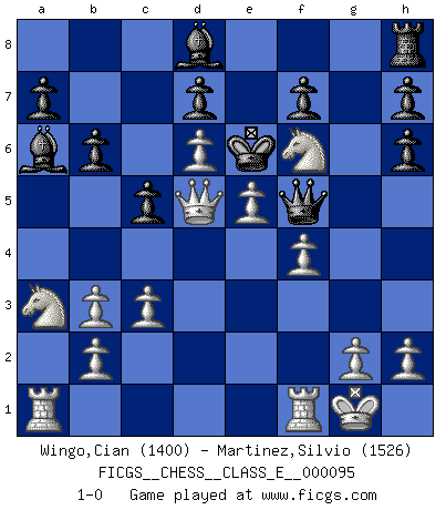 Last move : 1-0 2009 April 6 1:11:28 [Event "FICGS__CHESS__CLASS_E__000095"] [Site "FICGS"] [Date "2008.10.16"] [Round "1"] [White "Wingo,Cian"] [Black "Martinez,Silvio"] [Result "1-0"] [WhiteElo "1400"] [BlackElo "1526"] 1.e4 e5 2.Nf3 Nc6 3.Bc4 Nh6 4.d3 Na5 5.Bb3 Bb4+ 6.c3 Bc5 7.O-O b6 8.Bxh6 gxh6 9.Nxe5 Nxb3 10.axb3 Qf6 11.d4 Bd6 12.f4 c5 13.Qf3 Bb7 14.Na3 Ba6 15.Ng4 Qe6 16.e5 Be7 17.Qxa8+ Bd8 18.Nf6+ Ke7 19.d5 Qf5 20.d6+ Ke6 21.Qd5+ 1-0 King's pawn game Kingside Castling by player White (move 7) Player White won this chess game. Follow this game move after move (download)The passion for playing Chess is one of the most unaccountable in the world. (H.G. Wells) Den Ruhm habe ich schon, jetzt brauche ich noch das Geld. (Wilhelm Steinitz) Debió haber existido una vez en que los hombres eran semidióses, de otra manera no hubiesen podido inventar el Ajedrez. (Gustav Schenk) On peut tirer plus d'utilité d'une partie perdue que de 100 parties gagnées. (Capablanca) Don't anthropomorphize computers - they hate it. (Anonymous)