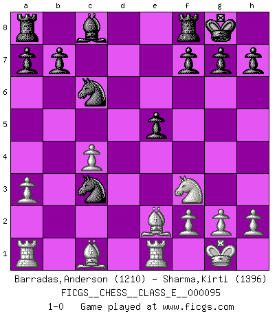 Last move : 1-0 2009 January 18 7:15:51 [Event "FICGS__CHESS__CLASS_E__000095"] [Site "FICGS"] [Date "2008.10.16"] [Round "1"] [White "Barradas,Anderson"] [Black "Sharma,Kirti"] [Result "1-0"] [WhiteElo "1210"] [BlackElo "1396"] 1.e4 d5 2.exd5 Nf6 3.c4 c6 4.Nc3 cxd5 5.d3 dxc4 6.dxc4 Qxd1+ 7.Nxd1 e5 8.Nc3 Bb4 9.a3 Bxc3+ 10.bxc3 O-O 11.Nf3 Nc6 12.Be2 Ne4 13.O-O Nxc3 14.Re1 1-0 This chess game has been lost on time (started : 2008.10.16 23:23:26) Scandinavian gambit Kingside Castling by player Black (move 10) Kingside Castling by player White (move 13) Player White won this chess game. Follow this game move after move (download)One bad move nullifies forty good ones. (Horowitz) Sitze auf Deine Hände. (Siegbert Tarrasch) Cuando tengo las piezas blancas, yo gano porque soy blanco; Cuando tengo las piezas negras, yo gano porque soy Bogolyubov. (Bogolyubov) Karpov est une pièce de musée. (Garry Kasparov) Life is pleasant. Death is peaceful. It's the transition that's troublesome. (Isaac Asimov)