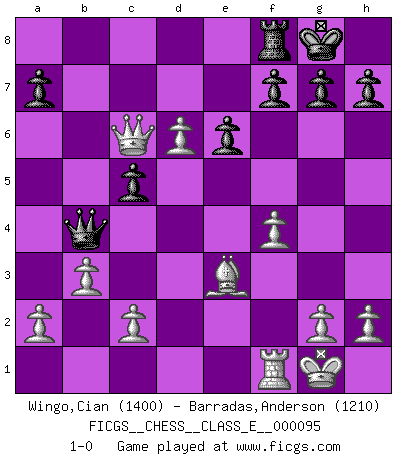 Last move : 1-0 2008 December 31 2:1:57 [Event "FICGS__CHESS__CLASS_E__000095"] [Site "FICGS"] [Date "2008.10.16"] [Round "1"] [White "Wingo,Cian"] [Black "Barradas,Anderson"] [Result "1-0"] [WhiteElo "1400"] [BlackElo "1210"] 1.e4 c5 2.Nc3 d6 3.f4 Nc6 4.Nf3 Bg4 5.Bb5 e6 6.Bxc6+ bxc6 7.d3 d5 8.O-O dxe4 9.Nxe4 Nf6 10.Be3 Bxf3 11.Qxf3 Nxe4 12.dxe4 Bd6 13.Rad1 O-O 14.e5 Qb6 15.Rxd6 Rad8 16.b3 Rxd6 17.exd6 Qb4 18.Qxc6 1-0 Sicilian : Closed Kingside Castling by player White (move 8) Kingside Castling by player Black (move 13) Player White won this chess game. Follow this game move after move (download)You must take your opponent into a deep dark forest where 2+2=5, and the path leading out is only wide enough for one. (Mikhail Tal) Auf Remis zu spielen ist gewissermaßen ein Verbrechen gegen das Schachspiel. (Mikhail Nekhemyevich Tal) El Ajedrez se juega con la mente... ¡no con las manos!. (Renaud y Kahn) Il n'y a pas de prix trop élevé au scalp de l'ennemi. (Koblentz) You can think I'm wrong, but that's no reason to quit thinking. (Gregory House, House M.D.)