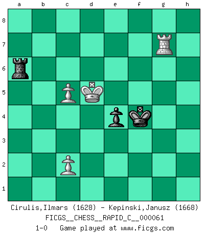 Last move : 1-0 2009 April 8 2:17:13 [Event "FICGS__CHESS__RAPID_C__000061"] [Site "FICGS"] [Date "2008.10.17"] [Round "1"] [White "Cirulis,Ilmars"] [Black "Kepinski,Janusz"] [Result "1-0"] [WhiteElo "1628"] [BlackElo "1668"] 1.f4 g6 2.Nc3 Bg7 3.e4 d6 4.d4 Nf6 5.Nf3 c5 6.Bb5+ Bd7 7.e5 Ng4 8.Bxd7+ Qxd7 9.dxc5 dxe5 10.Qxd7+ Nxd7 11.h3 Ngf6 12.fxe5 Nh5 13.g4 Nxe5 14.Nxe5 Ng3 15.Nxf7 Bxc3+ 16.bxc3 Kxf7 17.Rg1 Ne4 18.Rf1+ Ke8 19.Rb1 Nxc5 20.Be3 b6 21.Bxc5 bxc5 22.Rb7 h5 23.g5 Rf8 24.Rxf8+ Kxf8 25.h4 Kf7 26.Ke2 Ke6 27.Ke3 a6 28.a4 Rd8 29.Ra7 Rd6 30.Ke4 Rd2 31.Rxa6+ Kf7 32.a5 Rh2 33.Kd5 Rxh4 34.Ra8 Rg4 35.a6 Rxg5+ 36.Kc6 Rg1 37.Rh8 Ra1 38.Kb7 Rb1+ 39.Ka7 c4 40.Rb8 Rd1 41.Kb6 Rd6+ 42.Kb7 Rd7+ 43.Kc6 Rd6+ 44.Kb5 Rd5+ 45.Kb4 Rd7 46.Kxc4 g5 47.Kc5 g4 48.Rh8 g3 49.Rxh5 Rd6 50.a7 Ra6 51.Rh7+ Kg6 52.Rh3 Kf5 53.Rxg3 Rxa7 54.c4 e5 55.Kd6 Ra6+ 56.Kd5 e4 57.c5 Kf4 58.Rg7 1-0 This chess game has been lost on time (started : 2008.10.17 3:9:1) Bird's Opening 10 pieces endgame at move 46 : White KRPPP , Black KRPPP WHITE : King + 1 Rook 3 Pawns BLACK : King + 1 Rook 3 Pawns 9 pieces endgame at move 49 : White KRPPP , Black KRPP WHITE : King + 1 Rook 3 Pawns BLACK : King + 1 Rook 2 Pawns 8 pieces endgame at move 53 : White KRPPP , Black KRP WHITE : King + 1 Rook 3 Pawns BLACK : King + 1 Rook 1 Pawn 7 pieces endgame at move 53 : White KRPP , Black KRP WHITE : King + 1 Rook 2 Pawns BLACK : King + 1 Rook 1 Pawn Player White won this chess game. Follow this game move after move (download)After black's reply to 1.e4 with 1..e5, leaves him always trying to get into the game. (Howard Staunton) Jeder leidlich begabte Spieler, er braucht keineswegs hervorragend veranlagt zu sein, kann es zum Meister bringen. Aber das ist ja auch gar nicht nötig! Der richtige Standpunkt ist es, zu seinem Vergnügen zu spielen, und man glaube ja nicht, dass der Genuss proportional dem Können sei. (Siegbert Tarrasch) ¿Que sería del Ajedrez sin errores graciosos?. (Kurt Richter) On entre au jeu d'Echecs comme on entre en Religion. Pour le joueur d'Echecs, la partie d'Echecs c'est l'office, la messe, le défilé du 1er Mai, le dépôt de gerbe au Monument aux Morts. C'est un drame sacré. (Michel Roos) Don't be irreplaceable, if you can't be replaced, you can't be promoted. (Dan Rotaru)