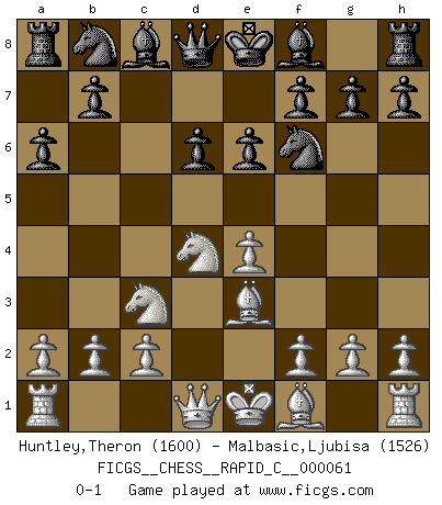 Last move : 0-1 2008 October 20 1:11:14 [Event "FICGS__CHESS__RAPID_C__000061"] [Site "FICGS"] [Date "2008.10.17"] [Round "1"] [White "Huntley,Theron"] [Black "Malbasic,Ljubisa"] [Result "0-1"] [WhiteElo "1600"] [BlackElo "1526"] 1.e4 c5 2.Nf3 d6 3.d4 cxd4 4.Nxd4 Nf6 5.Nc3 a6 6.Be3 e6 0-1 Sicilian : Najdorf, Byrne (English) attack Player Black won this chess game. Follow this game move after move (download)It is always better to sacrifice your opponent's men. (Savielly Tartakower) Er war ein guter Schachspieler, aber ich kann Leute nicht ausstehen, die 'Heil Hitler' rufen (Über Alexander Aljechin). (Miguel Najdorf) Nada excita más a Grandes Maestros aburridos que una novedad teórica. (Dominic Lawson) Vous savez, camarade Pachman, je n'éprouve pas de plaisir à être ministre, je jouerais plutôt aux échecs comme vous, ou alors ferais une révolution au Venezuela. (Che Guevara à Ludek Pachman, 'Checkmate in Prague', 1975) Don't be discouraged. It's often the last key in the bunch that opens the lock. (Author unknown)