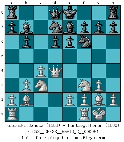 Last move : 1-0 2008 October 19 15:42:5 [Event "FICGS__CHESS__RAPID_C__000061"] [Site "FICGS"] [Date "2008.10.17"] [Round "1"] [White "Kepinski,Janusz"] [Black "Huntley,Theron"] [Result "1-0"] [WhiteElo "1668"] [BlackElo "1600"] 1.Nf3 Nf6 2.c4 c5 3.g3 e6 4.Nc3 b6 5.Bg2 Bb7 6.O-O Be7 7.d4 cxd4 8.Qxd4 d6 9.b3 Nbd7 10.Bb2 1-0 Reti Opening Kingside Castling by player White (move 6) Player White won this chess game. Follow this game move after move (download)If one piece is badly posted, the whole game is bad. (Tarrasch) Ivan Sokolov treibt mich als Beifahrer an mit go Loeky go - . (Loek van Wely) Ciertamente, de todas la drogas del mundo, el Ajedrez debe ser el mas placentero permamentemente. (Assiac) Les Echecs sont affaire de jugement sensible. Savoir quand frapper et quand esquiver. (Fischer) Warrior pose battles inner weakness and wins focus. You see that there is no war within you. You're on your own side, and you are your own strength. (Terri Guillemets)