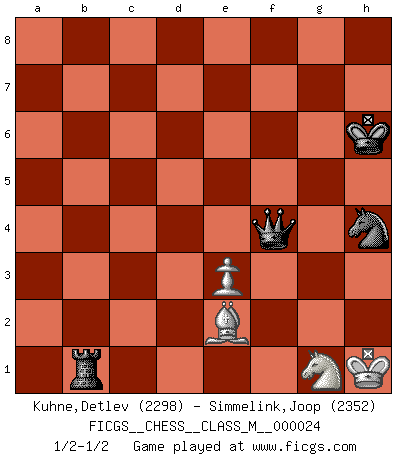 Last move : 1/2-1/2 2009 February 17 8:46:2 [Event "FICGS__CHESS__CLASS_M__000024"] [Site "FICGS"] [Date "2008.10.17"] [Round "1"] [White "Kuhne,Detlev"] [Black "Simmelink,Joop"] [Result "1/2-1/2"] [WhiteElo "2298"] [BlackElo "2352"] 1.Nf3 f5 2.d4 d6 3.g3 g6 4.Bg2 Bg7 5.O-O Nf6 6.c4 O-O 7.Nc3 Qe8 8.d5 a5 9.Nd4 Na6 10.b3 Nc5 11.Rb1 Bd7 12.e3 c6 13.Bb2 e5 14.dxe6 Bxe6 15.Qc2 Bf7 16.Rbd1 Qe7 17.Rfe1 Nfe4 18.Nde2 Rfd8 19.Nxe4 fxe4 20.Bxg7 Kxg7 21.Rd4 Nd3 22.Rd1 d5 23.Nf4 Nb4 24.Qb2 Qe5 25.cxd5 cxd5 26.h4 h6 27.Qe2 g5 28.hxg5 hxg5 29.Nh3 Nc6 30.R4d2 Rac8 31.Rf1 Rf8 32.Qb5 Rc7 33.Qe2 Be6 34.Qh5 Rf5 35.Rc1 Qf6 36.Rc5 Rf7 37.Qd1 Kf8 38.g4 Re5 39.Rcxd5 Bxd5 40.Rxd5 Rh7 41.a3 Rh6 42.Rxe5 Qxe5 43.Qd7 Rd6 44.Qxb7 Rd1+ 45.Bf1 Qe6 46.Qa6 Qxg4+ 47.Kh2 Qe6 48.Be2 Rd6 49.b4 axb4 50.axb4 Kg7 51.b5 Ne7 52.Qa1+ Qf6 53.Qa5 Ng6 54.b6 Kh6 55.Qb4 Rxb6 56.Qxe4 Rb2 57.Qg4 Qe5+ 58.Kg2 Nh4+ 59.Kh1 Rb1+ 60.Ng1 Qf6 61.f4 gxf4 62.Qxf4+ Qxf4 1/2-1/2 Reti v Dutch Kingside Castling by player White (move 5) Kingside Castling by player Black (move 6) 10 pieces endgame at move 61 : White KQBNP , Black KQRNP WHITE : King + 1 Queen 1 Bishop 1 Knight 1 Pawn BLACK : King + 1 Queen 1 Rook 1 Knight 1 Pawn 9 pieces endgame at move 62 : White KQBNP , Black KQRN WHITE : King + 1 Queen 1 Bishop 1 Knight 1 Pawn BLACK : King + 1 Queen 1 Rook 1 Knight 8 pieces endgame at move 62 : White KBNP , Black KQRN WHITE : King + 1 Bishop 1 Knight 1 Pawn BLACK : King + 1 Queen 1 Rook 1 Knight This chess game ended in a draw. Follow this game move after move (download)The most important feature of the Chess position is the activity of the pieces. This is absolutely fundamental in all phases of the game: Opening, Middlegame and especially Endgame. The primary constraint on a piece's activity is the Pawn structure. (Michael Stean) Die unerbitterlichsten Regeln im Schach sind die Ausnahmen. (Savielly Grigorievitsch Tartakower) Si tu oponente no puede hacer nada activo, entonces no apures la posición; En vez de eso, dejalo estar sentado ahí, sufriendo y rogandote por un empate. (Jeremy Silman) Botvinnik disait en comparant les échecs à la musique: Il existe une science dont le but est l'étude de l'acoustique et des sons. Mais il y a aussi un art qui se sert de l'océan des sons : c'est la musique. De toute évidence, il en est de même pour la pensée. La logique est l'étude des lois de la réflexion et les échecs reflètent, en tant qu'art, le côté logique de la réflexion, sous la forme d'images artistiques... Extrait de Fischer - Spassky, Reykjavik 1972 par Alexander & F. Wyndham (Ed. Solar), p 37. Some people are so afraid to die that they never begin to live. (Henry Van Dyke)