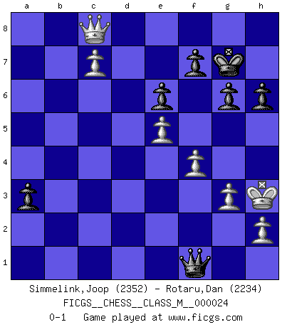 Last move : 0-1 2009 January 1 1:43:53 [Event "FICGS__CHESS__CLASS_M__000024"] [Site "FICGS"] [Date "2008.10.17"] [Round "1"] [White "Simmelink,Joop"] [Black "Rotaru,Dan"] [Result "0-1"] [WhiteElo "2352"] [BlackElo "2234"] 1.e4 c6 2.d4 d5 3.e5 c5 4.dxc5 Nc6 5.Bb5 e6 6.Be3 Nge7 7.c3 Nf5 8.Bd4 Bd7 9.Bxc6 Bxc6 10.Nf3 Nxd4 11.Qxd4 Qc7 12.Nbd2 Bb5 13.Nb3 a5 14.a4 Ba6 15.Qe3 Be7 16.Nfd4 O-O 17.f4 Bc4 18.Rg1 Rab8 19.Nb5 Qc8 20.N5d4 Bxb3 21.Nxb3 b5 22.cxb6 Bd8 23.Nd4 Bxb6 24.Rb1 Bxd4 25.Qxd4 Rb3 26.g3 Qb7 27.Rg2 Rc8 28.Rc2 Rc4 29.Qd1 h6 30.Kf2 Rxa4 31.Ra1 Rxa1 32.Qxa1 d4 33.Rd2 dxc3 34.bxc3 Qa7+ 35.Kg2 a4 36.Qd1 Rb8 37.Ra2 a3 38.Qc2 Qa8+ 39.Kh3 g6 40.c4 Qf3 41.Qe2 Qb3 42.c5 Rc8 43.Qa6 Qxa2 44.Qxc8+ Kg7 45.c6 Qc4 46.c7 Qf1+ 0-1 Caro-Kann : Advance variation Kingside Castling by player Black (move 16) Player Black won this chess game. Follow this game move after move (download)Live, lose, and learn, by observing your opponent how to win. (Amber Steenbock) Wie ich sie so einen nach dem anderen nieder mähte wurde meine Überlegenheit offensichtlich. (José Raúl Capablanca) Cuando le juegas a Fischer, no es una cuestion de si vas a ganar o perder. Es una cuestion de si vas a sobrevivir. (Boris Spassky) Je crois qu'il existe des manières très spécifiques de jouer efficacement contre une machine. Evidemment, nous n'avons aucune chance en technique pure, parce que l'ordinateur calcule de manière parfaite. Mais lorsque nous faisons appel à notre cerveau, en utilisant l'intuition et la compréhension, alors nous restons beaucoup plus forts. (Anatoli Karpov) Success without honor is an unseasoned dish; it will satisfy your hunger, but it won't taste good. (Joe Paterno)