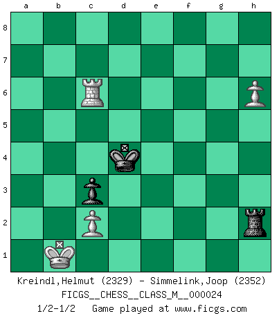 Last move : 1/2-1/2 2009 June 15 10:51:15 [Event "FICGS__CHESS__CLASS_M__000024"] [Site "FICGS"] [Date "2008.10.17"] [Round "1"] [White "Kreindl,Helmut"] [Black "Simmelink,Joop"] [Result "1/2-1/2"] [WhiteElo "2329"] [BlackElo "2352"] 1.d4 Nf6 2.Bg5 c5 3.d5 Qb6 4.Nc3 Qxb2 5.Bd2 Qb6 6.e4 e5 7.f4 d6 8.fxe5 dxe5 9.Nf3 Nbd7 10.Bc4 Bd6 11.O-O O-O 12.Nh4 Qd8 13.Nf5 Nb6 14.Nxd6 Qxd6 15.Be2 Bd7 16.a4 Ne8 17.Be3 Qc7 18.a5 Nc8 19.Qe1 Ne7 20.h4 f5 21.Bg5 Nf6 22.a6 b6 23.Rd1 Qd6 24.Bxf6 Rxf6 25.exf5 Rxf5 26.Ne4 Rxf1+ 27.Bxf1 Qg6 28.d6 Nf5 29.Bc4+ Kh8 30.Ng5 Rf8 31.Nf3 Bc6 32.h5 Qf6 33.Nxe5 Nxd6 34.Nxc6 Nxc4 35.Nxa7 b5 36.Nxb5 Qxa6 37.Qe7 Qf6 38.Qxf6 gxf6 39.Rd5 Rc8 40.Kf2 Kg7 41.g4 Kf8 42.Rd7 h6 43.Nd6 Nxd6 44.Rxd6 Ke7 45.Rd5 c4 46.Ra5 Rc6 47.Ra7+ Ke6 48.Rh7 Rd6 49.Ke3 Ke5 50.Rxh6 Ra6 51.Kd2 Ra3 52.Rh8 Rh3 53.Kc1 c3 54.Kb1 Kf4 55.Rg8 Rh2 56.Rg6 f5 57.gxf5 Kxf5 58.Rc6 Ke4 59.h6 Kd4 60.Rd6+ Kc4 61.Rc6+ Kd4 62.Rd6+ Kc4 63.Rc6+ Kd4 1/2-1/2 Trompowsky attack (Ruth, Opovcensky Opening) Kingside Castling by player White (move 11) Kingside Castling by player Black (move 11) 10 pieces endgame at move 44 : White KRPPP , Black KRPPP WHITE : King + 1 Rook 3 Pawns BLACK : King + 1 Rook 3 Pawns 9 pieces endgame at move 50 : White KRPPP , Black KRPP WHITE : King + 1 Rook 3 Pawns BLACK : King + 1 Rook 2 Pawns 8 pieces endgame at move 57 : White KRPPP , Black KRP WHITE : King + 1 Rook 3 Pawns BLACK : King + 1 Rook 1 Pawn 7 pieces endgame at move 57 : White KRPP , Black KRP WHITE : King + 1 Rook 2 Pawns BLACK : King + 1 Rook 1 Pawn This chess game ended in a draw. Follow this game move after move (download)I give 98 percent of my mental energy to Chess. Others give only 2 percent. (Bobby Fischer) Was ist der Unterschied zwischen einem Strassenarbeiter und einem Schachspieler? --Der Schachspieler bewegt sich ab und zu. (Anonymous) Todo se encuentra en un estado de flujo y esto incluye al mundo del Ajedrez. (Mikhail Botvinnik) Soyez une menace à chaque fois que vous vous asseyez pour jouer. (Ken Smith) It is not enough to be a good player... you must also play well. (Siegbert Tarrasch)