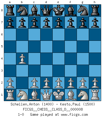 Last move : 1-0 2006 September 23 2:50:38 [Event "FICGS__CHESS__CLASS_D__000008"] [Site "FICGS"] [Date "2006.08.13"] [Round "1"] [White "Schellen,Anton"] [Black "Kesto,Paul"] [Result "1-0"] [WhiteElo "1400"] [BlackElo "1500"] 1.b4 1-0 This chess game has been lost on time (started : 2006.08.13 19:48:43) Polish (Sokolsky) opening Player White won this chess game. Follow this game move after move (download)No Chess Grandmaster is normal; they only differ in the extent of their madness. (Viktor Korchnoi) Bis zum Jahr 1971 verlief in meiner Schachkariere alles glatt. Dieses dramatische Match [Fischer-Taimanov 6:0] machte mein Leben zur Hölle. (Mark Taimanov) Hasta este punto, las blancas han seguido un análisis bien conocido. Pero ahora el hace un error fatal: empieza a usar su propia cabeza. (Siegbert Tarrasch) On croit qu'il y a plus de mauvais joueurs que de bons joueurs, c'est faux : Il y a autant de joueurs qui gagnent que de joueurs qui perdent. (Philippe Geluck) Creativity is allowing yourself to make mistakes. Art is knowing which ones to keep. (Scott Adams)