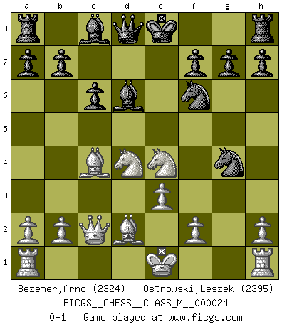 Last move : 0-1 2009 January 4 17:29:52 [Event "FICGS__CHESS__CLASS_M__000024"] [Site "FICGS"] [Date "2008.10.17"] [Round "1"] [White "Bezemer,Arno"] [Black "Ostrowski,Leszek"] [Result "0-1"] [WhiteElo "2324"] [BlackElo "2395"] 1.d4 d5 2.c4 c6 3.Nf3 Nf6 4.Nc3 e6 5.e3 Nbd7 6.Qc2 Bd6 7.g4 dxc4 8.Bxc4 e5 9.Bd2 exd4 10.Nxd4 Nxg4 11.Ne4 Ndf6 0-1 QGD Slav : 4.Nc3 Player Black won this chess game. Follow this game move after move (download)Some part of a mistake is always correct. (Savielly Tartakover) Die Fehler sind da, Sie warten nur darauf gemacht zu werden. (Savielly Grigorievitsch Tartakower) No puedes jugar al Ajedrez si eres de corazón noble. (Proverbio Francés) Un journaliste : 'Vous préférez avoir une dame de plus sur l'échiquier ou au lit ?' Boris Spassky : 'Ca dépend de la position.' Somehow our devils are never quite what we expect when we meet them face to face. (Nelson DeMille)