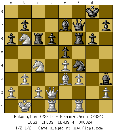 Last move : 1/2-1/2 2009 January 27 2:56:7 [Event "FICGS__CHESS__CLASS_M__000024"] [Site "FICGS"] [Date "2008.10.17"] [Round "1"] [White "Rotaru,Dan"] [Black "Bezemer,Arno"] [Result "1/2-1/2"] [WhiteElo "2234"] [BlackElo "2324"] 1.e4 c5 2.Nf3 d6 3.d4 cxd4 4.Nxd4 Nf6 5.Nc3 a6 6.Be3 e5 7.Nb3 Be6 8.f3 Nbd7 9.g4 Nb6 10.g5 Nh5 11.Qd2 Be7 12.O-O-O Rc8 13.Rg1 O-O 14.Kb1 g6 15.Qf2 Nc4 16.Bxc4 Bxc4 17.Na4 Be6 18.Nb6 Rc7 19.Na5 f6 20.gxf6 Rxf6 21.Qe2 Nf4 22.Qd2 Qf8 23.Rgf1 Qf7 24.b3 Bh3 25.Rf2 Be6 26.Nac4 Rc6 27.R2f1 Bh3 28.Rg1 Be6 29.Rgf1 Bh3 1/2-1/2 Sicilian : Najdorf, Byrne (English) attack Queenside Castling by player White (move 12) Kingside Castling by player Black (move 13) This chess game ended in a draw. Follow this game move after move (download)A big shock; the best chess player in history has passed away. (Lajos Portisch, about Bobby Fischer's death) Ich moechte nie einem Club beitreten, der Leute wie mich als Mitglieder aufnimmt. (Woody Allen) Cada Peón es potencialmente una Reina. (James Mason) La tactique, c'est ce que vous faites quand il y a quelque chose à faire; la stratégie, c'est ce que vous faites quand il n'y a rien à faire. (Savielli Tartacower) The smarter you play, the luckier you'll be. (Mark Pilarski)