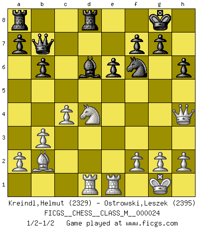 Last move : 1/2-1/2 2008 December 11 0:55:39 [Event "FICGS__CHESS__CLASS_M__000024"] [Site "FICGS"] [Date "2008.10.17"] [Round "1"] [White "Kreindl,Helmut"] [Black "Ostrowski,Leszek"] [Result "1/2-1/2"] [WhiteElo "2329"] [BlackElo "2395"] 1.Nf3 Nf6 2.d4 d5 3.c4 c6 4.e3 e6 5.Nc3 Nbd7 6.Qc2 Bd6 7.Be2 O-O 8.O-O Qe7 9.b3 b6 10.Bb2 Bb7 11.Rfe1 h6 12.e4 Nxe4 13.Nxe4 dxe4 14.Qxe4 Nf6 15.Qh4 Rfd8 16.Ne5 c5 17.Bf3 Bxf3 18.Nxf3 cxd4 19.Nxd4 Qb7 20.Rad1 1/2-1/2 Reti Opening Kingside Castling by player Black (move 7) Kingside Castling by player White (move 8) This chess game ended in a draw. Follow this game move after move (download)In Chess, just as in life, today's bliss may be tomorrow's poison. (Assaic) Der Bart als Geschlechtszeichen mitten im Gesicht ist obszön. Daher gefällt er den Weibern. [Zugegeben, kein Schachzitat, aber unglaublich originell] (Arthur Schopenhauer) El juego de Damas es para vagabundos. (Paul Morphy) Les Cavaliers se révèlent fort utiles dans les positions fermées. D'habitude, les Fous sont un peu plus forts que les Cavaliers dans les positions ouvertes. Qu'on le veuille ou non, il restera toujours des exceptions ! Crush them ! Make them suffer ! (General Grievous in Star Wars ep.3)