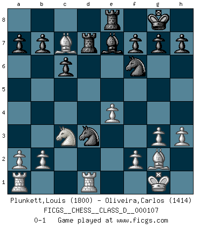 Last move : 0-1 2009 January 28 19:57:47 [Event "FICGS__CHESS__CLASS_D__000107"] [Site "FICGS"] [Date "2008.10.18"] [Round "1"] [White "Plunkett,Louis"] [Black "Oliveira,Carlos"] [Result "0-1"] [WhiteElo "1800"] [BlackElo "1414"] 1.c4 Nf6 2.g3 e6 3.Bg2 Be7 4.Nf3 O-O 5.Nc3 d5 6.cxd5 exd5 7.O-O c6 8.d3 Re8 9.Re1 Bg4 10.h3 Bxf3 11.Bxf3 Nbd7 12.e4 Ne5 13.Bg2 dxe4 14.dxe4 Qxd1 15.Rxd1 Rad8 16.Bf4 Nd3 17.Bc7 Rd7 0-1 This chess game has been lost on time (started : 2008.10.18 8:30:58) English, 1...Nf6 (Anglo-Indian defense) Kingside Castling by player Black (move 4) Kingside Castling by player White (move 7) Player Black won this chess game. Follow this game move after move (download)The King is a fighting piece. Use it ! (Wilhelm Steinitz) Intelligenz läßt sich nicht am Weg, sondern nur am Ergebnis feststellen. (Garry Kasparov) No nos podemos resistir a la fascinación de un sacrificio ya que la pasión por los sacrificios es parte de la naturaleza de un jugador de Ajedrez. (Rudolf Spielman) Dieu déplace le joueur, et celui-ci la pièce. Quel Dieu derrière Dieu commence donc la trame ? Arturo Perez-Reverte (prix de littérature policière 1993). Excelling at chess has long been considered a symbol of more general intelligence. That is an incorrect assumption in my view, as pleasant as it might be. But for the purposes of argument and investigation, chess is, in Russkin-Gutman's words, 'an unparalleled laboratory, since both the learning process and the degree of ability obtained can be objectified and quantified, providing an excellent comparative framework on which to use rigorous analytical techniques.' (The Chess Master and the Computer, by Garry Kasparov - 2010)