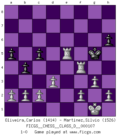 Last move : 1-0 2009 April 12 1:13:56 [Event "FICGS__CHESS__CLASS_D__000107"] [Site "FICGS"] [Date "2008.10.18"] [Round "1"] [White "Oliveira,Carlos"] [Black "Martinez,Silvio"] [Result "1-0"] [WhiteElo "1414"] [BlackElo "1526"] 1.e4 e5 2.Nf3 Nc6 3.Bb5 Nd4 4.Nxd4 c6 5.Bxc6 dxc6 6.Nf5 Bxf5 7.exf5 Nh6 8.Qf3 Bd6 9.d3 O-O 10.f6 Qxf6 11.Qxf6 gxf6 12.Bxh6 Rfe8 13.Nc3 b5 14.O-O b4 15.Ne4 Rad8 16.Nxf6+ Kh8 17.Nxe8 Rxe8 18.Rfe1 f5 19.Bd2 f4 20.Re4 a5 21.Bxf4 Rf8 22.Bxe5+ Kg8 23.Bxd6 Rf6 24.Bg3 c5 25.Rae1 Kg7 26.Be5 Kg6 27.Bxf6 Kxf6 28.Rf4+ Kg5 29.g3 h6 30.Re5+ 1-0 Ruy Lopez : Bird's defense Kingside Castling by player Black (move 9) Kingside Castling by player White (move 14) Player White won this chess game. Follow this game move after move (download)The passion for playing Chess is one of the most unaccountable in the world. (H.G. Wells) Bis zum Jahr 1971 verlief in meiner Schachkariere alles glatt. Dieses dramatische Match [Fischer-Taimanov 6:0] machte mein Leben zur Hölle. (Mark Taimanov) El ganar no lo es todo... pero el perder es nada. (Mednis) Le thème de l'attaque double intervient d'une manière ou d'une autre dans l'immense majorité des combinaisons. (Youri Averbakh) When you stop learning you start dying. (M. Scott Adams)