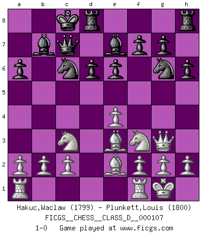 Last move : 1-0 2009 January 30 8:10:31 [Event "FICGS__CHESS__CLASS_D__000107"] [Site "FICGS"] [Date "2008.10.18"] [Round "1"] [White "Hakuc,Waclaw"] [Black "Plunkett,Louis"] [Result "1-0"] [WhiteElo "1799"] [BlackElo "1800"] 1.e4 c5 2.Nf3 e6 3.Nc3 a6 4.Be2 Qc7 5.d4 cxd4 6.Qxd4 Nc6 7.Qe3 b5 8.O-O Bb7 9.Qg5 h6 10.Qh4 Nge7 11.Qf4 d6 12.Bxb5 O-O-O 13.Be2 Ng6 14.Qg3 Be7 15.Be3 1-0 This chess game has been lost on time (started : 2008.10.18 8:30:58) Sicilian defense Kingside Castling by player White (move 8) Queenside Castling by player Black (move 12) Player White won this chess game. Follow this game move after move (download)Fischer is an American Chess tragedy on par with Morphy and Pillsbury. (Mig Greengard) Sie führen leise Selbstgespräche, schlürfen lautstark ihre Getränke, schmatzen hörbar beim Essen, blasen ihrem Gegenüber Rauch in die Augen, niesen ihm ins Gesicht, starren ihn unverwandt an, bis er sich unter ihren Blicken windet, rutschen ständig auf ihrem Stuhl hin und her, rülpsen und bohren in der Nase. (Anonymous) Un juego de Ajedrez es un dialogo, una conversación entre un jugador y su oponente. Cada movimiento del oponente puede contener amenazas o tropiezos, pero un jugador no se puede defender de las amenazas o tomar ventaja de los tropiezos si es que no se pregunta a sí mismo: ¿Que es lo que mi oponente va a hacer después de cada movida?. (Bruce A. Moon) Les Echecs sont affaire de jugement sensible. Savoir quand frapper et quand esquiver. (Fischer) Question: Is 'This statement is paradoxical' a paradoxical statement ? Or is it a meta-paradox ? (Normajean Yates)
