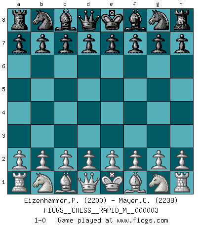 Last move : 1-0 2006 September 25 0:56:26 [Event "FICGS__CHESS__RAPID_M__000003"] [Site "FICGS"] [Date "2006.08.14"] [Round "1"] [White "Eizenhammer,Peter"] [Black "Mayer,Cristian"] [Result "1-0"] [WhiteElo "2200"] [BlackElo "2238"] 1-0 Player White won this chess game. Follow this game move after move (download)The tactician must know what to do whenever something needs doing; the strategist must know what to do when nothing needs doing. (Savielly Tartakover) Dein Körper muss in Topform sein. Dein Schach verfällt, wenn dein Körper verfällt. Der Körper kann nicht vom Geist getrennt werden. (Robert James Fischer) La belleza de un movimiento no se refleja solo en su apariencia, sino en el pensamiento detrás de él. (Siegbert Tarrasch) Plusieurs personnes se sont demandées comment Tal faisait pour gagner... En fait, c'est très simple ! Il met ses pièces au centre de l'échiquier et les sacrifie quelque part ! (David Bronstein) Life is like a play: it's not the length but the excellence of the acting that matters. (Seneca)