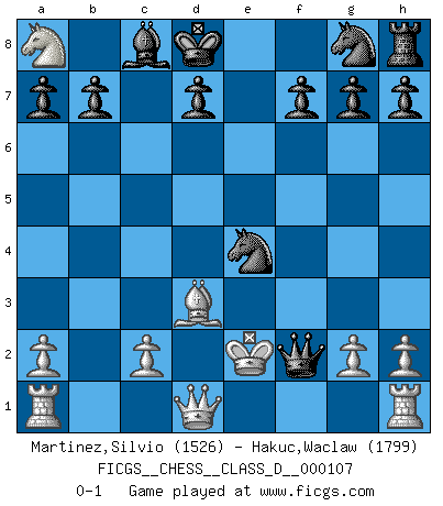 Last move : 0-1 2008 December 14 17:7:23 [Event "FICGS__CHESS__CLASS_D__000107"] [Site "FICGS"] [Date "2008.10.18"] [Round "1"] [White "Martinez,Silvio"] [Black "Hakuc,Waclaw"] [Result "0-1"] [WhiteElo "1526"] [BlackElo "1799"] 1.e4 e5 2.Nf3 Nc6 3.d4 exd4 4.Nxd4 Bc5 5.Be3 Qf6 6.Nc3 Nxd4 7.Nd5 Qe5 8.Bd3 Ne6 9.Bxc5 Nxc5 10.b4 Nxe4 11.Ne3 Qc3+ 12.Ke2 Qxb4 13.Nd5 Qd4 14.Nxc7+ Kd8 15.Nxa8 Qxf2+ 0-1 Scotch game Player Black won this chess game. Follow this game move after move (download)One bad move nullifies forty good ones. (Horowitz) Nicht daß Diemer aus Opportunismus Mitglied der NSDAP geworden wäre. Er war ein Fanatiker, in allem, was er tat. (Hans Ree) En la vida, como en el Ajedrez, los Peones propios obstruyen nuestro camino. La gran fortuna de un hombre, su comodidad, placer, hijos, libros, que deberían ayudarle a ganar, con mucha frecuencia lo ponen en Jaque Mate. (Charles Buxton) Les échecs, c'est la lutte contre l'erreur. (Johannes Zukertort) I couldn't make any sense out of what this particular thread is about. It sounds like R2 D2 computer speaking. A space fight ?!? Some 'command' problems in Moscow ? Some killers & narcotic addicts attacking some game & a god wannabe ?? (Dinesh De Silva, lost in a russian conflict in FICGS forum)