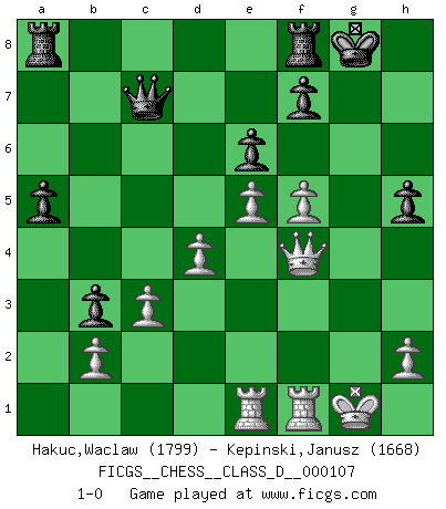 Last move : 1-0 2009 February 12 21:5:22 [Event "FICGS__CHESS__CLASS_D__000107"] [Site "FICGS"] [Date "2008.10.18"] [Round "1"] [White "Hakuc,Waclaw"] [Black "Kepinski,Janusz"] [Result "1-0"] [WhiteElo "1799"] [BlackElo "1668"] 1.e4 e6 2.d4 d5 3.e5 b6 4.c3 Be7 5.Qg4 g6 6.Bd3 Ba6 7.Bxa6 Nxa6 8.Qe2 Qc8 9.Nf3 c5 10.O-O Nc7 11.Be3 c4 12.Bg5 Qd8 13.Qd2 Bxg5 14.Nxg5 Ne7 15.Qf4 Nf5 16.Nf3 O-O 17.Na3 Ne8 18.Qg4 Neg7 19.Nc2 h5 20.Qf4 Qc7 21.Rab1 a5 22.Ne3 Nxe3 23.fxe3 b5 24.e4 dxe4 25.Ng5 b4 26.Rbe1 Nf5 27.Nxe4 b3 28.Nf6+ Kg7 29.Nxh5+ Kg8 30.axb3 cxb3 31.g4 gxh5 32.gxf5 1-0 French : Advance variation Kingside Castling by player White (move 10) Kingside Castling by player Black (move 16) Player White won this chess game. Follow this game move after move (download)We cannot resist the fascination of sacrifice, since a passion for sacrifices is part of a Chessplayer's nature. (Rudolf Spielman) Das Schach hält seine Meister in eigenen Banden, Fesseln; auf vielerlei Weise formt es ihren Geist, so dass die innere Freiheit selbst des Stärksten beeinflusst wird. (Albert Einstein) El Ajedrez, como cualquier otra actividad creativa, puede existir solo a través de méritos combinados de aquellos que tienen talento creativo y de aquellos que tienen la habilidad de organizar un trabajo creativo. (Mikhail Botvinnik) Le pion, dans sa simplicité, marche droit devant lui, mais lorsqu'il prend, il le fait obliquement? Ainsi l'homme, tant qu'il reste pauvre, marche dans la droiture et vit honnêtement, mais lorsqu'il recherche les honneurs, il flatte, se parjure et, par les voies obliques, cherche une position supérieure sur l'échiquier du monde. (Jean de Galles) He is a liar. I just don't know what the lie is yet. (Horatio Caine, C.S.I. Miami)