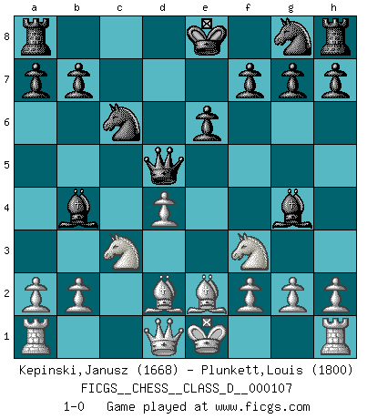 Last move : 1-0 2009 January 14 18:53:5 [Event "FICGS__CHESS__CLASS_D__000107"] [Site "FICGS"] [Date "2008.10.18"] [Round "1"] [White "Kepinski,Janusz"] [Black "Plunkett,Louis"] [Result "1-0"] [WhiteElo "1668"] [BlackElo "1800"] 1.e4 c5 2.c3 d5 3.exd5 Qxd5 4.d4 Nc6 5.Nf3 Bg4 6.Be2 cxd4 7.cxd4 e6 8.Nc3 Bb4 9.Bd2 1-0 This chess game has been lost on time (started : 2008.10.18 8:30:58) Sicilian : Alapin's variation (2.c3) Player White won this chess game. Follow this game move after move (download)Chess opens and enriches your mind. (Saudin Robovic) Sicherlich können nur Meister einen Stil haben. Daß ein nicht-Meister auch nur ein einziges Mal in seinem Leben eine Partie folgerecht durchführte, habe ich niemals bemerkt. (Emanuel Lasker) Los problemas de Ajedrez exigen del compositor las mismas virtudes que caracterizan todo el arte de valor: originalidad, invención, concisión, armonía, complejidad e insinceridad explendida. (Vladimir Nabokov) Je ne crois pas en la psychologie, je crois aux bons coups. (Robert Fischer) We need strong personalities and only one world champion to attract sponsors. (Anatoly Karpov)