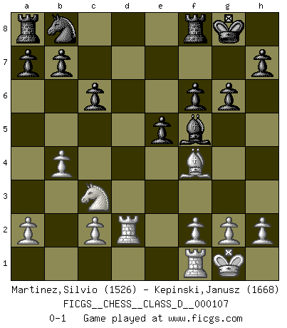 Last move : 0-1 2009 April 6 0:22:30 [Event "FICGS__CHESS__CLASS_D__000107"] [Site "FICGS"] [Date "2008.10.18"] [Round "1"] [White "Martinez,Silvio"] [Black "Kepinski,Janusz"] [Result "0-1"] [WhiteElo "1526"] [BlackElo "1668"] 1.d4 Nf6 2.Nc3 g6 3.e4 d6 4.Nf3 Bg7 5.Bc4 O-O 6.O-O Nxe4 7.Nxe4 d5 8.Bxd5 Qxd5 9.Nc3 Qh5 10.Bf4 c6 11.Nd2 Qxd1 12.Raxd1 Bxd4 13.Nde4 Bxc3 14.Nxc3 Bf5 15.Rd2 f6 16.b4 e5 0-1 This chess game has been lost on time (started : 2008.10.18 8:30:58) Queen's pawn game Kingside Castling by player Black (move 5) Kingside Castling by player White (move 6) Player Black won this chess game. Follow this game move after move (download)If you aren't afraid of Spassky, then I have removed the element of money. (Jim Slater) Wenn Du einsam bist, wenn Du Dich in der Welt wie ein Fremder fühlst, spiele Schach. Das wird Deinen Geist erheben und Dein Ratgeber im Kampf sein. (Aristoteles) ¿Se han dado cuenta de que Fischer casi nunca ha tenido piezas malas? El las intercambia y las piezas malas se quedan con sus oponenets. (Yuri Balashov) La vérité est comme le meilleur coup aux échecs : elle existe, mais il faut la chercher. (Arturo Perez-Reverte) Philosophers use a language that is already deformed as though by shoes that are too tight. (Ludwig Wittgenstein)