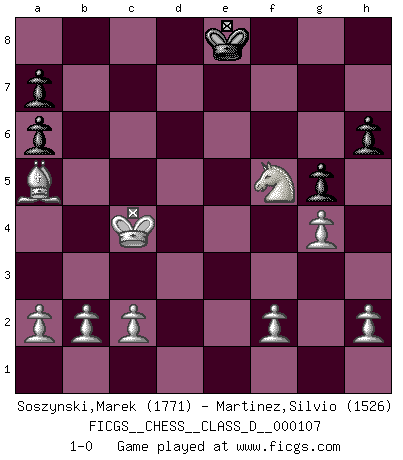 Last move : 1-0 2009 March 6 10:16:46 [Event "FICGS__CHESS__CLASS_D__000107"] [Site "FICGS"] [Date "2008.10.18"] [Round "1"] [White "Soszynski,Marek"] [Black "Martinez,Silvio"] [Result "1-0"] [WhiteElo "1771"] [BlackElo "1526"] 1.e4 e5 2.d4 Nf6 3.dxe5 Nxe4 4.Qe2 d5 5.exd6 Qxd6 6.Qxe4+ Qe7 7.Qxe7+ Bxe7 8.Bf4 Na6 9.Nc3 O-O 10.O-O-O h6 11.Nd5 c6 12.Nxe7+ Kh8 13.Nxc8 Raxc8 14.Nf3 g5 15.Be5+ f6 16.Bd6 Rfd8 17.Bxa6 bxa6 18.Be7 Rxd1+ 19.Rxd1 f5 20.Rd8+ Rxd8 21.Bxd8 Kg8 22.Kd2 Kf7 23.Nd4 c5 24.Nxf5 Kg6 25.g4 c4 26.Kc3 Kf7 27.Kxc4 Ke8 28.Ba5 1-0 This chess game has been lost on time (started : 2008.10.18 8:30:58) King's pawn game Kingside Castling by player Black (move 9) Queenside Castling by player White (move 10) Player White won this chess game. Follow this game move after move (download)Pawns are born free, yet they are everywhere in chains. (Rick Kennedy) Vom Schach wurde gesagt das Leben sei dafür nicht lange genug. Aber das ist der Fehler des Lebens, nicht des Schach'. (Irving Chernev) Aquellos que dicen entender al Ajedrez, no entienden nada. (Robert Hubner) La menace est plus forte que l'exécution. (Aaron Nimzovitch) Without deviation from the norm, progress is not possible. (Frank Zappa)
