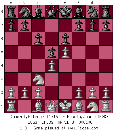 Last move : 1-0 2008 December 2 10:39:2 [Event "FICGS__CHESS__RAPID_B__000106"] [Site "FICGS"] [Date "2008.10.19"] [Round "1"] [White "Clement,Etienne"] [Black "Buscia,Juan"] [Result "1-0"] [WhiteElo "1716"] [BlackElo "1800"] 1.Nc3 d5 2.d4 e6 3.e4 c6 4.e5 1-0 This chess game has been lost on time (started : 2008.10.19 9:51:48) Dunst (Sleipner, Heinrichsen) Opening Player White won this chess game. Follow this game move after move (download)What is the object of playing a gambit opening?... To acquire a reputation of being a dashing player at the cost of losing a game. (Siegbert Tarrasch) Über die Verhaftung Bobby Fischers: Warum es die Bush-Administration für nötig befindet einen 61 Jahre alten Mann zu hetzten, der für niemanden ausser sich selbste eine Gefahr darstellt ist ein Rätsel. (Nigel Short) No hay precio que no valga la pena por la cabellera del Rey enemigo. (Koblentz) Dieu déplace le joueur, et celui-ci la pièce. Quel Dieu derrière Dieu commence donc la trame ? Arturo Perez-Reverte (prix de littérature policière 1993). Kids, you tried your best and you failed miserably. The lesson is, never try. (Simpsons)
