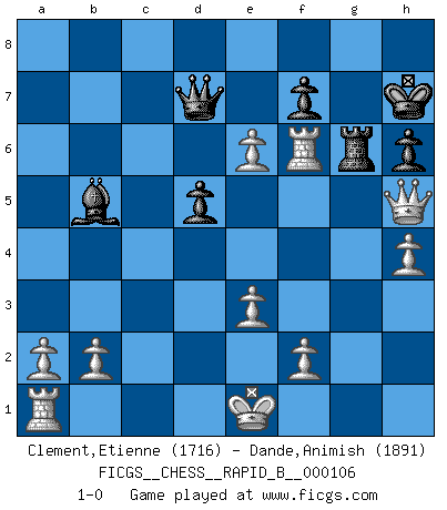 Last move : 1-0 2008 December 17 1:15:7 [Event "FICGS__CHESS__RAPID_B__000106"] [Site "FICGS"] [Date "2008.10.19"] [Round "1"] [White "Clement,Etienne"] [Black "Dande,Animish"] [Result "1-0"] [WhiteElo "1716"] [BlackElo "1891"] 1.Nf3 d5 2.d4 Nd7 3.c4 c6 4.cxd5 cxd5 5.Nc3 Ngf6 6.Bg5 e6 7.Ne5 Be7 8.e3 a6 9.Qa4 Rb8 10.Bf4 b5 11.Nxb5 axb5 12.Bxb5 O-O 13.Nc6 Ra8 14.Qxa8 Qe8 15.Nxe7+ Qxe7 16.Qa4 e5 17.Bg5 h6 18.Bxd7 Bxd7 19.Bxf6 gxf6 20.Qd1 Bb5 21.h4 Qd7 22.Rh3 Kh8 23.Qh5 Kh7 24.dxe5 Rg8 25.Rf3 Rxg2 26.Rxf6 Rg6 27.e6 1-0 Reti Opening Kingside Castling by player Black (move 12) Player White won this chess game. Follow this game move after move (download)An attack on the wing should be met by play in the center. (Nimzovitch) Ivan Sokolov treibt mich als Beifahrer an mit go Loeky go - . (Loek van Wely) Personalmente, yo prefiero mirar hacia el futuro en donde un programa de computadora gane el título mundial de Ajedrez. La humanidad necesita una lección de humildad. (Richard Dawkings) Les Echecs sont et restent toujours un combat, un combat intégral comme la boxe, la lutte ou un autre sport, et où il doit y avoir un vainqueur et un vaincu. (Joseph Emil Diemer) CHESS, n. f. [echecs, Fr.] A nice and abstruse game, in which two sets of puppets are moved in opposition to each other. (Dr Samuel Johnson, A Dictionary Of The English Language, 1755)
